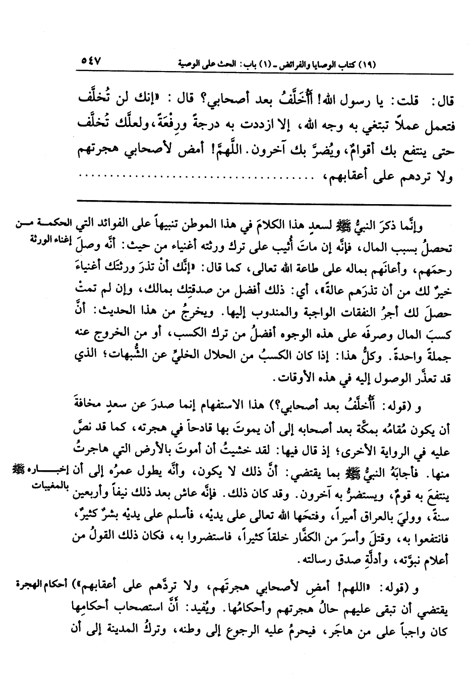 قَالَ: قُلتُ: يَا رَسُولَ اللَّهِ، أأُخَلَّفُ بَعدَ أَصحَابِي؟ قَالَ: إِنَّكَ لَن تُخَلَّفَ فَتَعمَلَ عَمَلًا تَبتَغِي بِهِ وَجهَ اللَّهِ إِلَّا ازدَدتَ بِهِ دَرَجَةً وَرِفعَةً، وَلَعَلَّكَ تُخَلَّفُ حَتَّى يُنتفَعَ بِكَ أَقوَامٌ وَيُضَرَّ بِكَ آخَرُونَ، اللَّهُمَّ أَمضِ لِأَصحَابِي هِجرَتَهُم، وَلَا تَرُدَّهُم عَلَى أَعقَابِهِم،