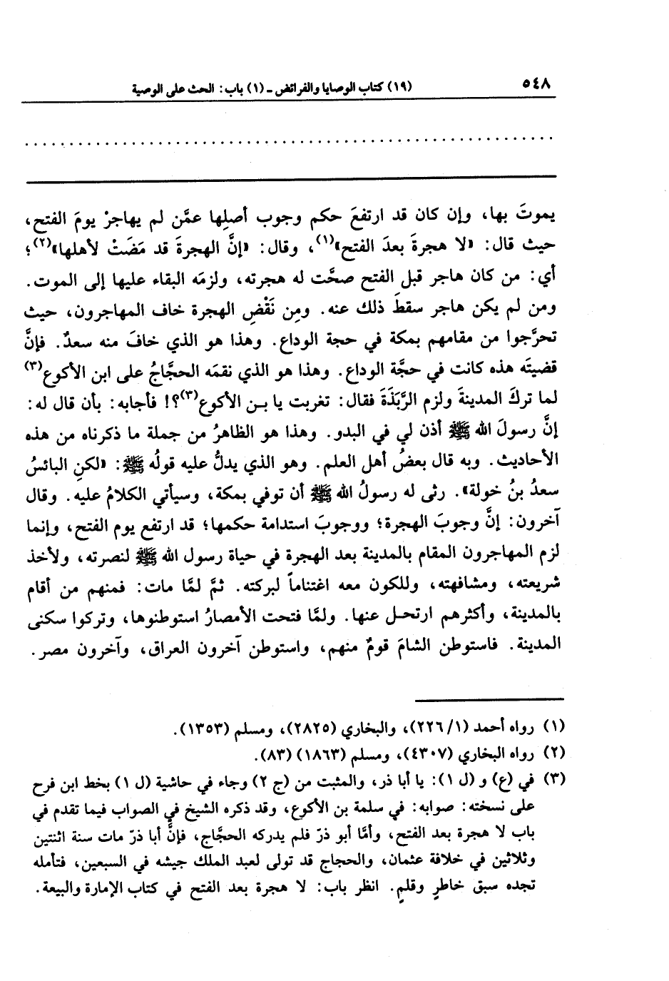 يموت بها، وإن كان قد ارتفع حكم وجوب أصلها عمن لم يهاجر يوم الفتح، حيث قال: (لا هجرة بعد الفتح) (¬1) وقال: (إن الهجرة قد مضت لأهلها) (¬2) أي: من كان هاجر قبل الفتح صحَّت له هجرته، ولزمه البقاء عليها إلى الموت. ومن لم يكن هاجر سقط ذلك عنه. ومن نقض الهجرة خاف المهاجرون، حيث تحرَّجوا من مقامهم بمكة في حجة الوداع. وهذا هو الذي خاف منه سعد. فإن قضيته هذه كانت في حجة الوداع. وهذا هو الذي نقمه الحجَّاجُ على ابن الأكوع (¬3) لما ترك المدينة ولزم الربذة فقال: تغربت يا ابن الأكوع (3)؟ ! فأجابه: بأن قال له: إن رسول الله صلى الله عليه وسلم أذن لي في البدو. وهذا هو الظاهر من جملة ما ذكرناه من هذه الأحاديث. وبه قال بعض أهل العلم. وهو الذي يدلُّ عليه قوله صلى الله عليه وسلم: (لكن البائسُ سعدُ بن خولة) رثى له رسول الله صلى الله عليه وسلم أن توفي بمكة، وسيأتي الكلام عليه.
