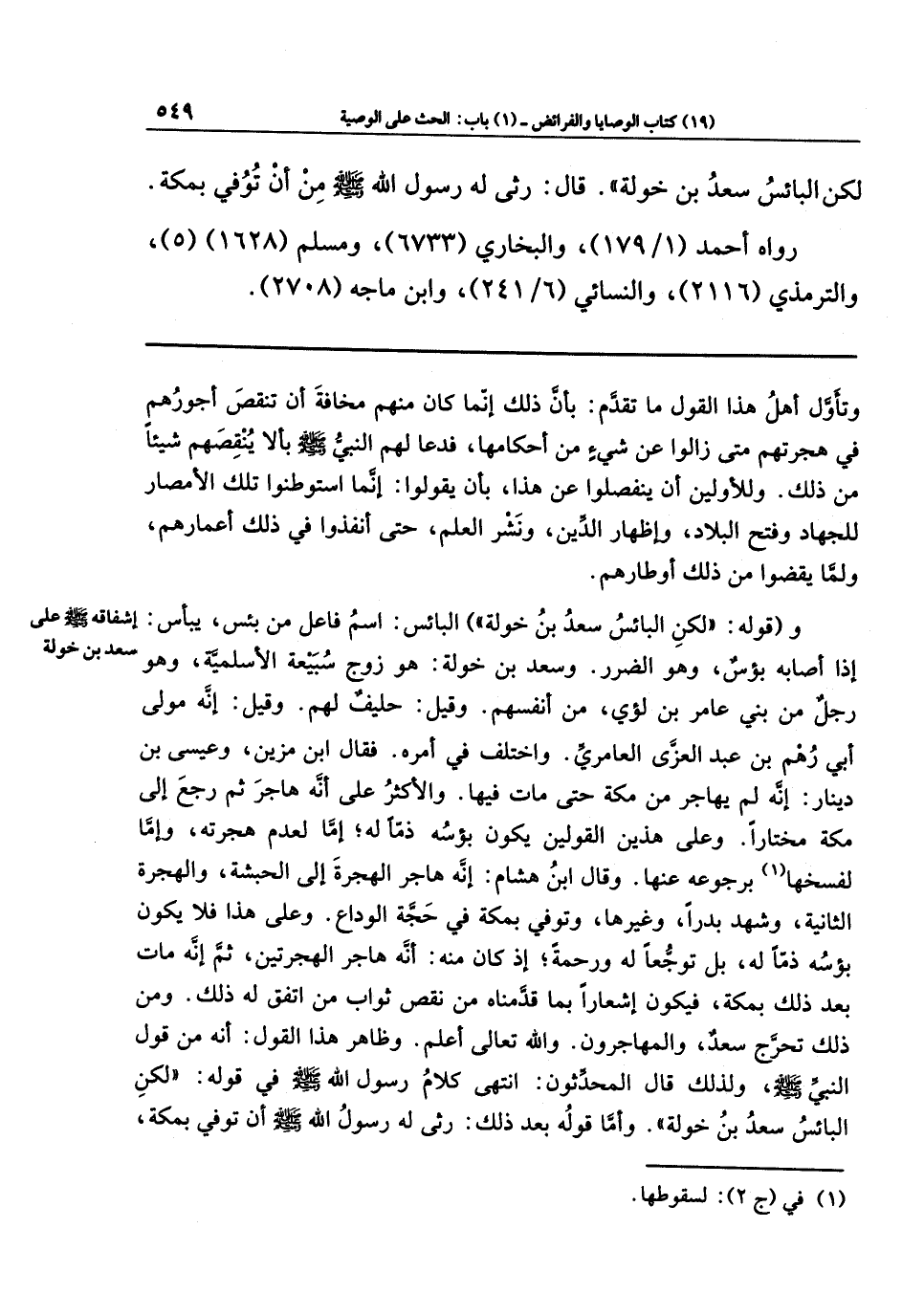 لَكِن البَائِسُ سَعدُ بنُ خَولَةَ. قَالَ: رَثَى لَهُ رَسُولُ اللَّهِ صَلَّى اللَّهُ عَلَيهِ وَسَلَّمَ مِن أَن تُوُفِّيَ بِمَكَّةَ.