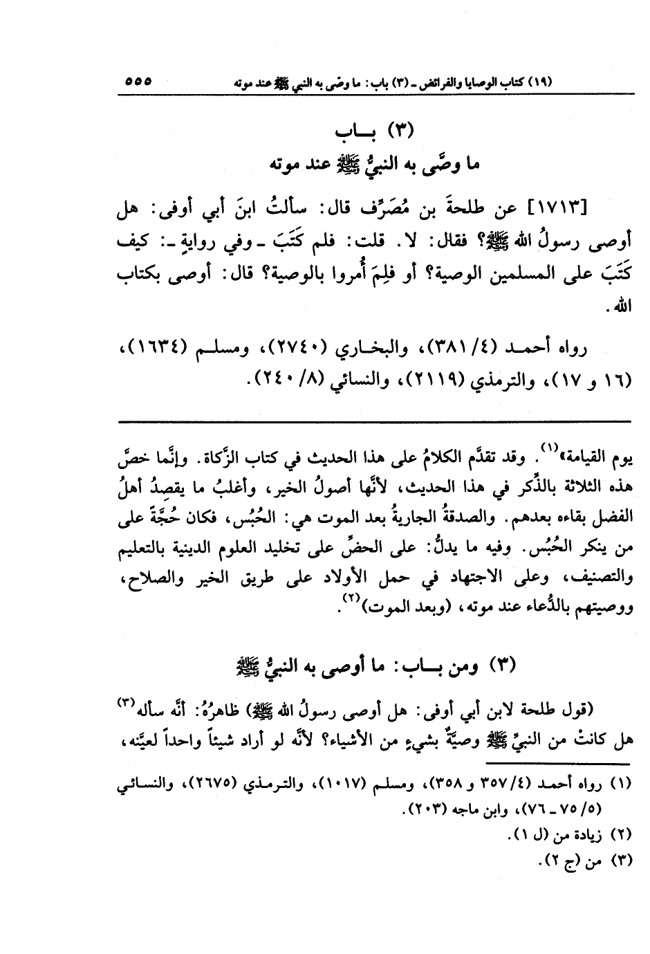 [1713] عَن طَلحَةَ بنِ مُصَرِّفٍ قَالَ: سَأَلتُ ابنَ أَبِي أَوفَى: هَل أَوصَى رَسُولُ اللَّهِ صَلَّى اللهُ عَلَيهِ وَسَلَّمَ؟ فَقَالَ: لَا. قُلتُ: فَلِمَ كُتِبَ، وفي رواية: كيف كتب عَلَى المُسلِمِينَ الوَصِيَّةُ؟ أَو فَلِمَ أُمِرُوا بِالوَصِيَّةِ؟ قَالَ: أَوصَى بِكِتَابِ اللَّهِ.