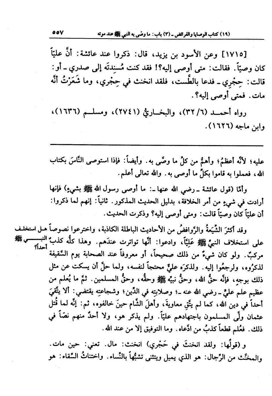 [1715] وعَن الأَسوَدِ بنِ يَزِيدَ قَالَ: ذَكَرُوا عِندَ عَائِشَةَ: أَنَّ عَلِيًّا كَانَ وَصِيًّا، فَقَالَت: مَتَى أَوصَى إِلَيهِ؟ فَقَد كُنتُ مُسنِدَتَهُ إِلَى صَدرِي أَو قَالَت حَجرِي فَدَعَا بِالطَّستِ، فَلَقَد انخَنَثَ فِي حَجرِي وَمَا شَعَرتُ أَنَّهُ مَاتَ، فَمَتَى أَوصَى إِلَيهِ؟ .