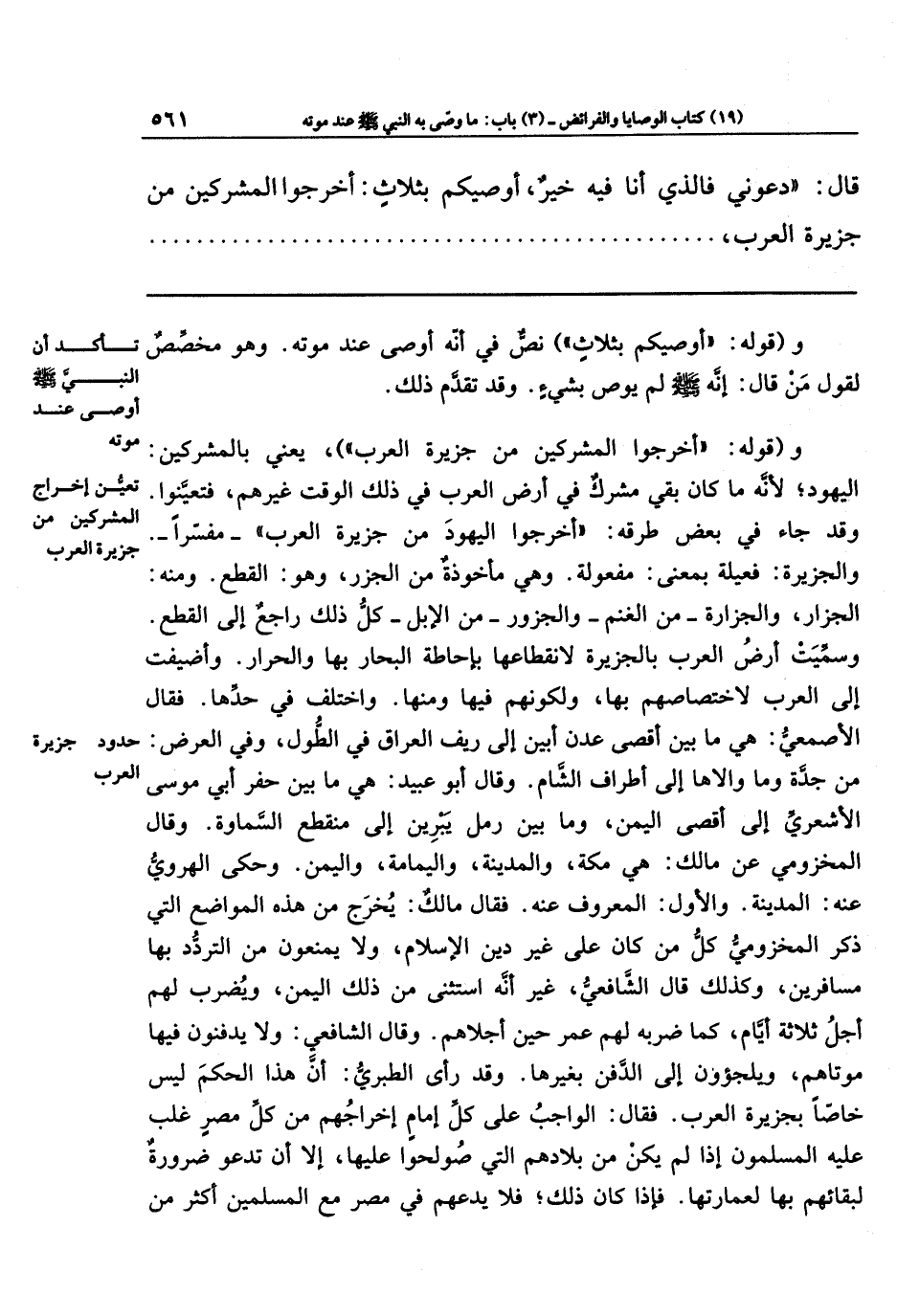 وقوله أخرجوا المشركين من جزيرة العرب، يعني بالمشركين اليهود؛ لأنه ما كان بقي مشرك في أرض العرب في ذلك الوقت غيرهم فتعيَّنوا، وقد جاء في بعض طرقه أخرجوا اليهود من جزيرة العرب مفسّرًا.