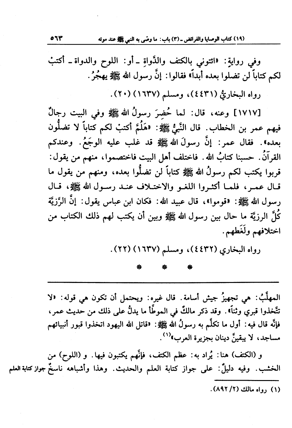 [1717] وعنه قَالَ: لَمَّا حُضِرَ رَسُولُ اللَّهِ صَلَّى اللَّهُ عَلَيهِ وَسَلَّمَ وَفِي البَيتِ رِجَالٌ فِيهِم عُمَرُ بنُ الخَطَّابِ، قَالَ النَّبِيُّ صَلَّى اللهُ عَلَيهِ وَسَلَّمَ: هَلُمَّ أَكتُب لَكُم كِتَابًا لَا تَضِلُّونَ بَعدَهُ. فَقَالَ عُمَرُ: إِنَّ رَسُولَ اللَّهِ صَلَّى اللَّهُ عَلَيهِ وَسَلَّمَ قَد غَلَبَ عَلَيهِ الوَجَعُ، وَعِندَكُم القُرآنُ، حَسبُنَا كِتَابُ اللَّهِ، فَاختَلَفَ أَهلُ البَيتِ فَاختَصَمُوا، مِنهُم مَن يَقُولُ قَرِّبُوا يَكتُب لَكُم رَسُولُ اللَّهِ صَلَّى اللَّهُ عَلَيهِ وَسَلَّمَ كِتَابًا لَن تَضِلُّوا بَعدَهُ، وَمِنهُم مَن يَقُولُ مَا قَالَ عُمَرُ، فَلَمَّا أَكثَرُوا اللَّغوَ وَالِاختِلَافَ عِندَ رَسُولِ اللَّهِ صَلَّى اللهُ عَلَيهِ وَسَلَّمَ، قَالَ رَسُولُ اللَّهِ صَلَّى اللهُ عَلَيهِ وَسَلَّمَ: قُومُوا. قَالَ عُبَيدُ اللَّهِ: فَكَانَ ابنُ عَبَّاسٍ يَقُولُ: إِنَّ الرَّزِيَّةَ كُلَّ الرَّزِيَّةِ مَا حَالَ بَينَ رَسُولِ اللَّهِ صَلَّى اللَّهُ عَلَيهِ وَسَلَّمَ وَبَينَ أَن يَكتُبَ لَهُم ذَلِكَ الكِتَابَ مِن اختِلَافِهِم وَلَغَطِهِم.