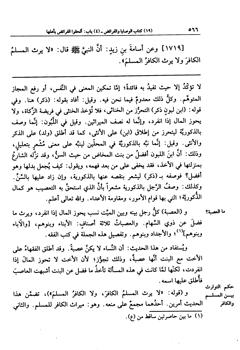[1719] وعَن أُسَامَةَ بنِ زَيدٍ أَنَّ النَّبِيَّ صَلَّى اللَّهُ عَلَيهِ وَسَلَّمَ قَالَ: لَا يَرِثُ المُسلِمُ الكَافِرَ، وَلَا يَرِثُ الكَافِرُ المُسلِمَ.