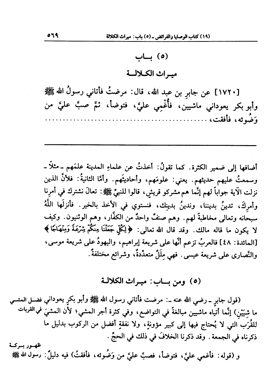 [1720] عَن جَابِرَ بنَ عَبدِ اللَّهِ قَالَ: مَرِضتُ، فَأَتَانِي رَسُولُ اللَّهِ صَلَّى اللَّهُ عَلَيهِ وَسَلَّمَ وَأَبُو بَكرٍ يَعُودَانِي مَاشِيَينِ، فَأُغمِيَ عَلَيَّ، فَتَوَضَّأَ ثُمَّ صَبَّ عَلَيَّ مِن وَضُوئِهِ، فَأَفَقتُ