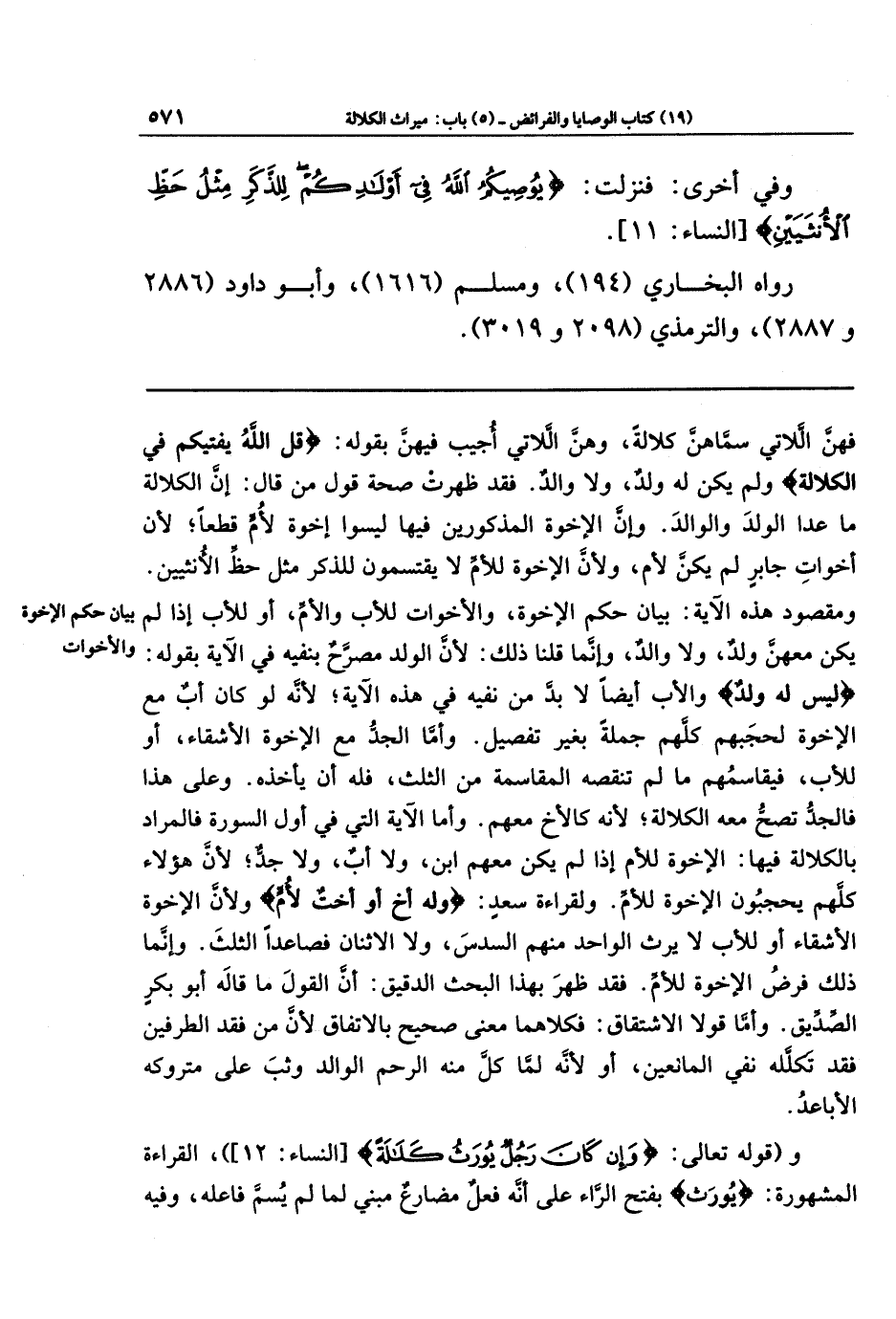 فهنَّ اللاتي سَمَّاهنَّ كلالة، وهنَّ اللاتي أجيب فيهنَّ بقوله: {قُلِ اللَّهُ يُفتِيكُم فِي الكَلالَةِ} ولم يكن له ولد ولا والد، فقد ظهرت صحَّة قول من قال: إن الكلالة ما عدا الولدَ والوالد، وإن الإخوة المذكورين فيها ليسوا إخوة لأم قطعًا؛ لأن أخوات جابر لم يكن لأم، ولأن الإخوة للأم لا يقتسمون للذكر مثل حظِّ الأنثيين. ومقصود هذه الآية بيان حكم الإخوة والأخوات للأب والأم أو للأب إذا لم يكن معهنَّ ولدٌ ولا والدٌ، وإنما قلنا ذلك لأن الولد مصرَّحٌ بنفيه في الآية بقوله {لَيسَ لَهُ وَلَدٌ} والأب أيضًا لا بدَّ من نفيه في هذه الآية؛ لأنه لو كان أبٌ مع الإخوة لحجبهم كلَّهم جملة بغير تفصيل. وأمَّا الجدَّ مع الإخوة الأشقاء أو للأب فيقاسمهم ما لم تنقصه المقاسمة من الثلث فله أن يأخذه، وعلى هذا فالجدّ تصحُّ معه الكلالة لأنه كالأخ معهم، وأما الآية التي في أول السورة فالمراد بالكلالة فيها الإخوة للأم إذا لم يكن معهم ابن ولا أب ولا جدّ؛ لأن هؤلاء كلّهم يحجبون الإخوة للأم. ولقراءة سعد: وله أخ أو أخت لأم، ولأن الإخوة الأشقاء أو للأب لا يرث الواحد منهم السدس ولا الاثنان فصاعدا الثلث، وإنما ذلك فرض الإخوة للأم، فقد ظهر بهذا البحث الدقيق أن القول ما قاله أبو بكر الصدِّيق. وأمَّا قولا الاشتقاق فكلاهما معنى صحيح بالاتفاق؛ لأن من فقد الطرفين فقد تَكلَّله نفي المانعين، أو لأنه لما كلَّ منه الرحم الوالد وثب على متروكه الأباعد.
