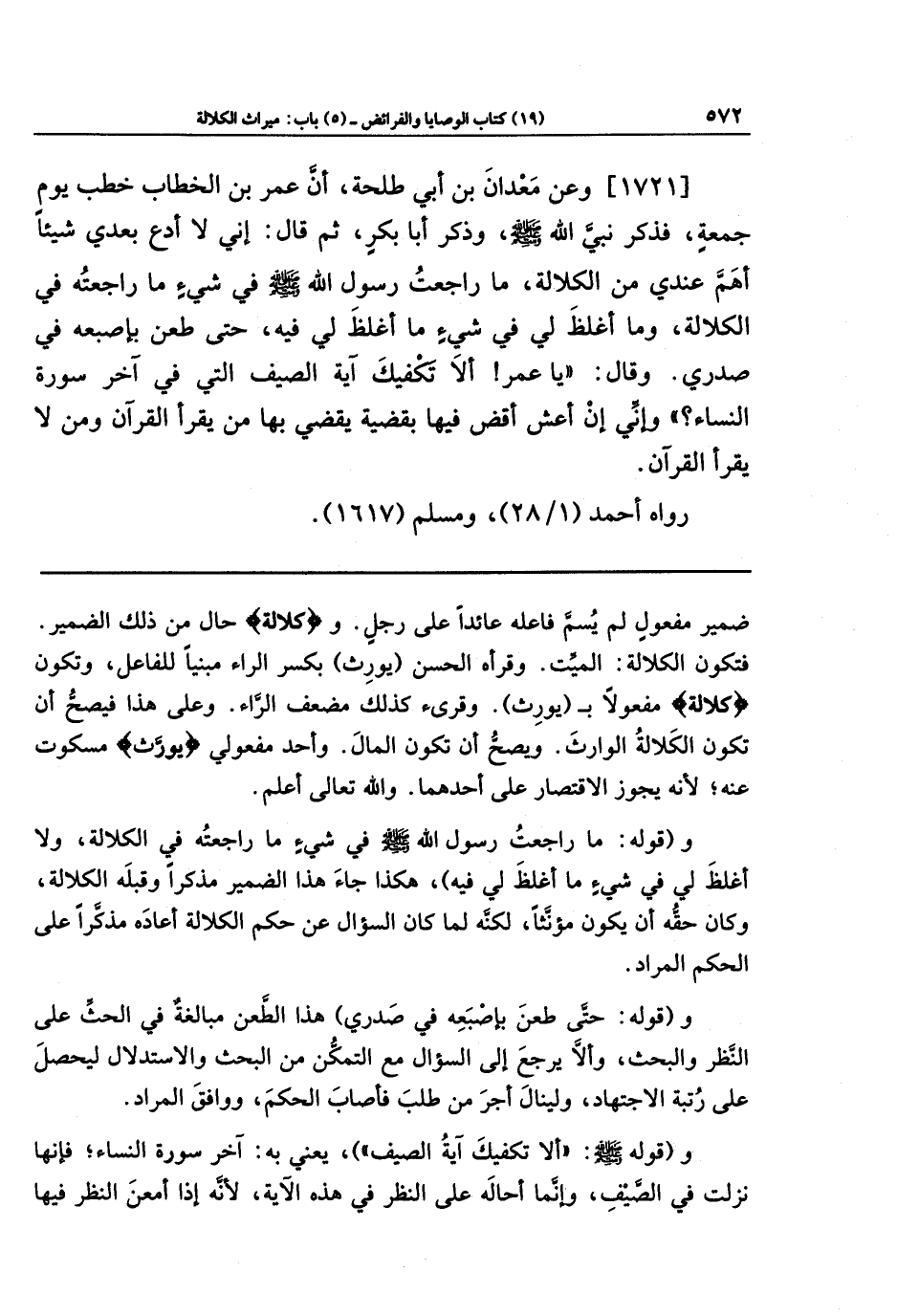 [1721] وعَن مَعدَانَ بنِ أَبِي طَلحَةَ أَنَّ عُمَرَ بنَ الخَطَّابِ خَطَبَ يَومَ جُمُعَةٍ فَذَكَرَ نَبِيَّ اللَّهِ صَلَّى اللَّهُ عَلَيهِ وَسَلَّمَ وَذَكَرَ أَبَا بَكرٍ، ثُمَّ قَالَ: إِنِّي لَا أَدَعُ بَعدِي شَيئًا أَهَمَّ عِندِي مِن الكَلَالَةِ، مَا رَاجَعتُ رَسُولَ اللَّهِ صَلَّى اللَّهُ عَلَيهِ وَسَلَّمَ فِي شَيءٍ مَا رَاجَعتُهُ فِي الكَلَالَةِ، وَمَا أَغلَظَ لِي فِي شَيءٍ مَا أَغلَظَ لِي فِيهِ، حَتَّى طَعَنَ بِإِصبَعِهِ فِي صَدرِي وَقَالَ: يَا عُمَرُ، أَلَا تَكفِيكَ آيَةُ الصَّيفِ الَّتِي فِي آخِرِ سُورَةِ النِّسَاءِ! وَإِنِّي إِن أَعِش أَقضِ فِيهَا بِقَضِيَّةٍ يَقضِي بِهَا مَن يَقرَأُ القُرآنَ وَمَن لَا يَقرَأُ القُرآنَ.