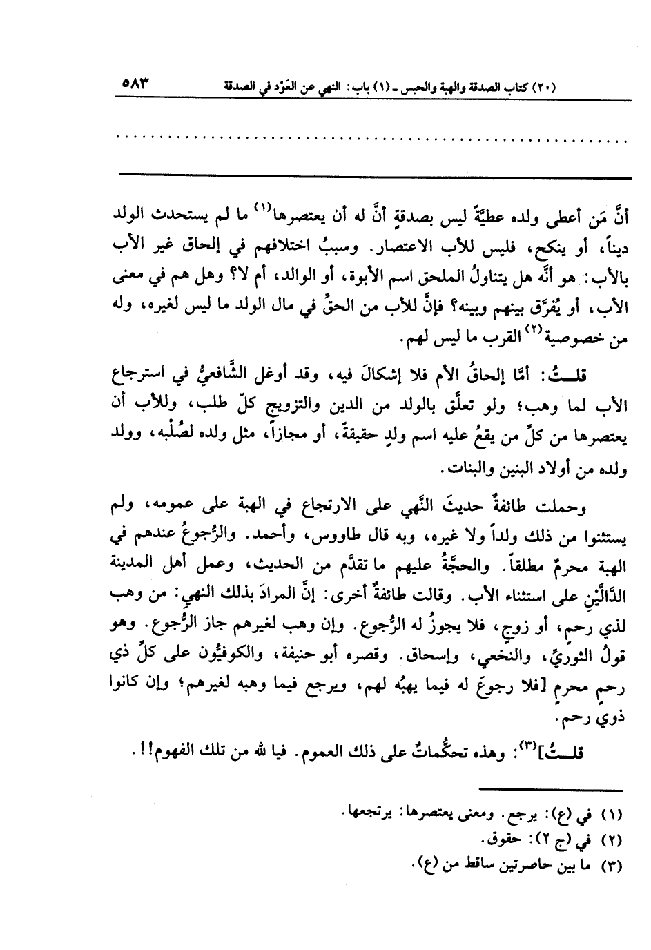 وحملت طائفة حديث النَّهي عن الارتجاع في الهبة على عمومه، ولم يستثنوا من ذلك ولدًا ولا غيره، وبه قال طاووس وأحمد، والرجوع عندهم في الهبة محرم مطلقا، والحجة عليهم ما تقدَّم من الحديث وعمل أهل المدينة الدَّالّين على استثناء الأب، وقالت طائفة أخرى: إن المراد بذلك النهي من وهب لذي رحم أو زوج فلا يجوز له الرُّجوع، وإن وهب لغيرهم جاز الرُّجوع - وهو قول الثوري والنخعي وإسحاق، وقصره أبو حنيفة والكوفيون على كل ذي رحم محرم فلا رجوع له فيما يهبه لهم، ويرجع فيما وهبه لغيرهم وإن كانوا ذوي رحم.
