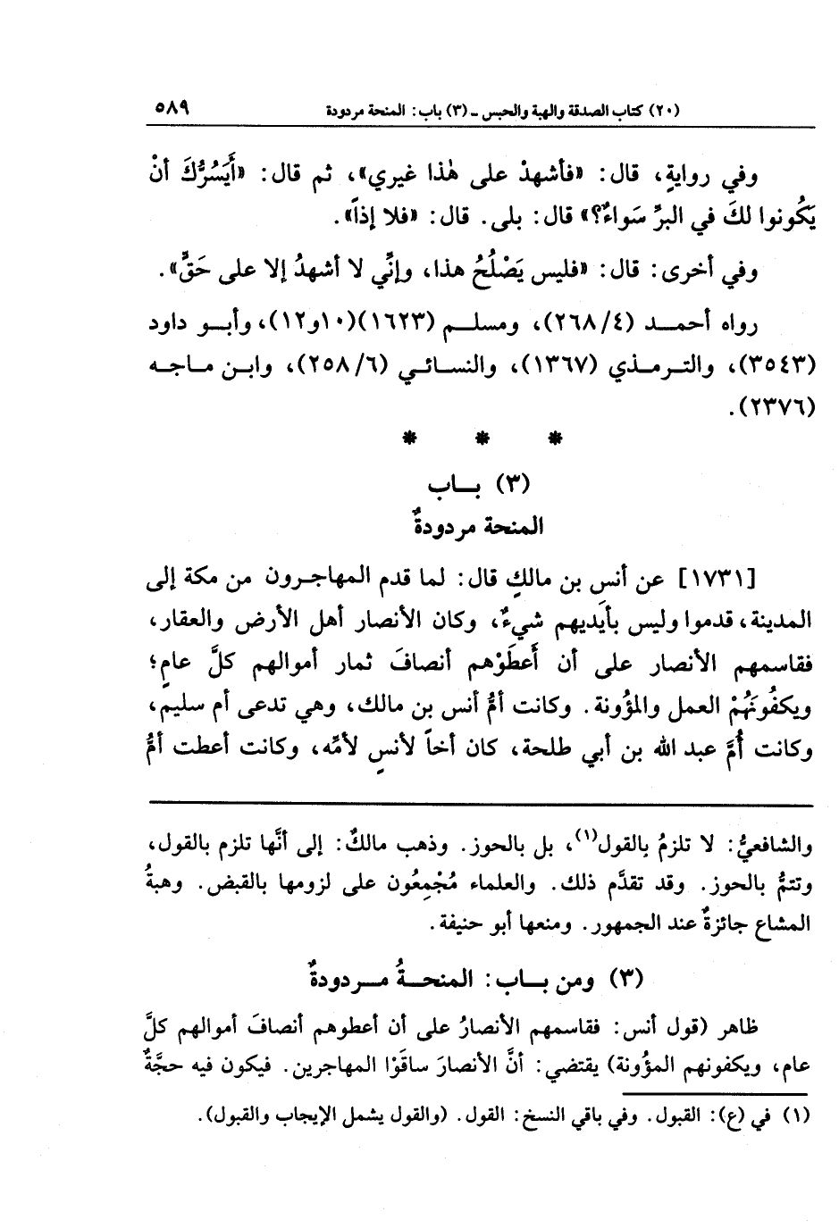 [1731] عَن أَنَسِ بنِ مَالِكٍ قَالَ: لَمَّا قَدِمَ المُهَاجِرُونَ مِن مَكَّةَ إلى المَدِينَةَ قَدِمُوا وَلَيسَ بِأَيدِيهِم شَيءٌ، وَكَانَ الأَنصَارُ أَهلَ الأَرضِ وَالعَقَارِ، فَقَاسَمَهُم الأَنصَارُ عَلَى أَن أَعطَوهُم أَنصَافَ ثِمَارِ أَموَالِهِم كُلَّ عَامٍ وَيَكفُونَهُم العَمَلَ وَالمَؤونَةَ، وَكَانَت أُمُّ أَنَسِ بنِ مَالِكٍ - وَهِيَ تُدعَى أُمَّ سُلَيمٍ، وَكَانَت أُمُّ عَبدِ اللَّهِ بنِ أَبِي طَلحَةَ، كَانَ أَخًا لِأَنَسٍ لِأُمِّهِ، وَكَانَت أَعطَت أُمُّ