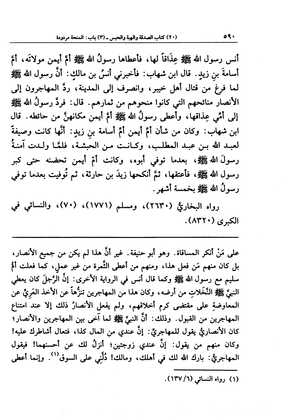 أَنَسٍ رَسُولَ اللَّهِ صَلَّى اللَّهُ عَلَيهِ وَسَلَّمَ عِذَاقًا لَهَا، فَأَعطَاهَا رَسُولُ اللَّهِ صَلَّى اللَّهُ عَلَيهِ وَسَلَّمَ أُمَّ أَيمَنَ مَولَاتَهُ أُمَّ أُسَامَةَ بنِ زَيدٍ. قَالَ ابنُ شِهَابٍ: فَأَخبَرَنِي أَنَسُ بنُ مَالِكٍ أَنَّ رَسُولَ اللَّهِ صَلَّى اللَّهُ عَلَيهِ وَسَلَّمَ لَمَّا فَرَغَ مِن قِتَالِ أَهلِ خَيبَرَ وَانصَرَفَ إِلَى المَدِينَةِ رَدَّ المُهَاجِرُونَ إِلَى الأَنصَارِ مَنَائِحَهُم الَّتِي كَانُوا مَنَحُوهُم مِن ثِمَارِهِم. قَالَ: فَرَدَّ رَسُولُ اللَّهِ صَلَّى اللَّهُ عَلَيهِ وَسَلَّمَ إِلَى أُمِّي عِذَاقَهَا، وَأَعطَى رَسُولُ اللَّهِ صَلَّى اللَّهُ عَلَيهِ وَسَلَّمَ أُمَّ أَيمَنَ مَكَانَهُنَّ مِن حَائِطِهِ. قَالَ ابنُ شِهَابٍ: وَكَانَ مِن شَأنِ أُمِّ أَيمَنَ - أُمِّ أُسَامَةَ بنِ زَيدٍ - أَنَّهَا كَانَت وَصِيفَةً لِعَبدِ اللَّهِ بنِ عَبدِ المُطَّلِبِ، وَكَانَت مِن الحَبَشَةِ، فَلَمَّا وَلَدَت آمِنَةُ رَسُولَ اللَّهِ صَلَّى اللَّهُ عَلَيهِ وَسَلَّمَ بَعدَمَا تُوُفِّيَ أَبُوهُ، وَكَانَت أُمُّ أَيمَنَ تَحضُنُهُ حَتَّى كَبِرَ رَسُولُ اللَّهِ صَلَّى اللهُ عَلَيهِ وَسَلَّمَ فَأَعتَقَهَا، ثُمَّ أَنكَحَهَا زَيدَ بنَ حَارِثَةَ، ثُمَّ تُوُفِّيَت بَعدَمَا تُوُفِّيَ رَسُولُ اللَّهِ صَلَّى اللَّهُ عَلَيهِ وَسَلَّمَ بِخَمسَةِ أَشهُرٍ.