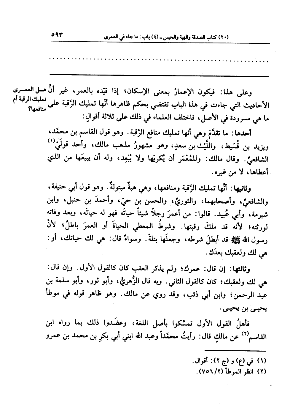 وعلى هذا: فيكون الإعمار بمعنى الإسكان؛ إذا قيّده بالعمر، غير أن الأحاديث التي جاءت في هذا الباب تقتضي بحكم ظاهرها أنَّها تمليك الرَّقبة على ما هي مسرودة في الأصل، فاختلف العلماء في ذلك على ثلاثة أقوال: