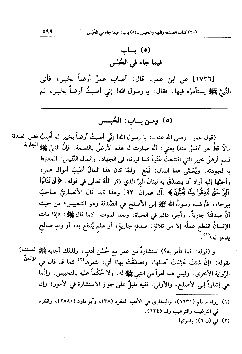 [1736] عَن ابنِ عُمَرَ، قَالَ: أَصَابَ عُمَرُ أَرضًا بِخَيبَرَ، فَأَتَى النَّبِيَّ صَلَّى اللَّهُ عَلَيهِ وَسَلَّمَ يَستَأمِرُهُ فِيهَا، فَقَالَ: يَا رَسُولَ اللَّهِ، إِنِّي أَصَبتُ أَرضًا بِخَيبَرَ لَم