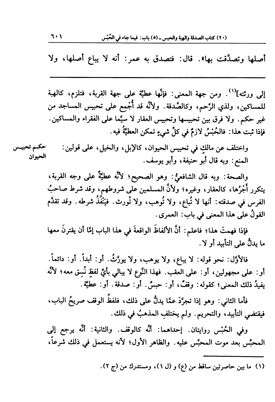 واختلف عن مالك في تحبيس الحيوان؛ كالإبل، والخيل، على قولين: المنع؛ وبه قال أبو حنيفة، وأبو يوسف.