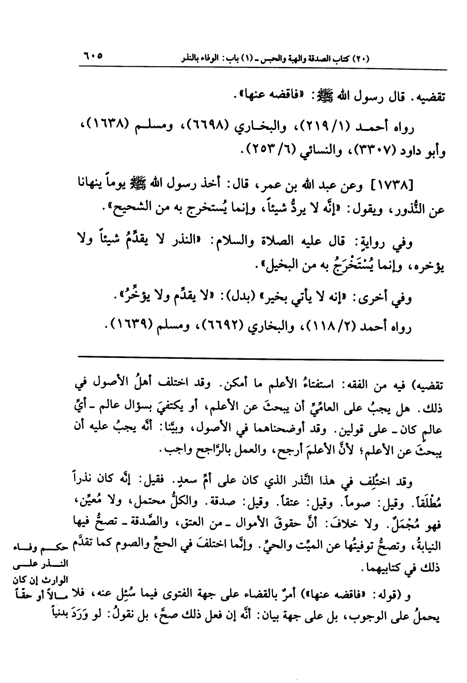 [1738] وعَن عَبدِ اللَّهِ بنِ عُمَرَ قَالَ: أَخَذَ رَسُولُ اللَّهِ صَلَّى اللَّهُ عَلَيهِ وَسَلَّمَ يَومًا يَنهَانَا عَن النَّذورِ وَيَقُولُ: إِنَّهُ لَا يَرُدُّ شَيئًا، وَإِنَّمَا يُستَخرَجُ بِهِ مِن الشَّحِيحِ.