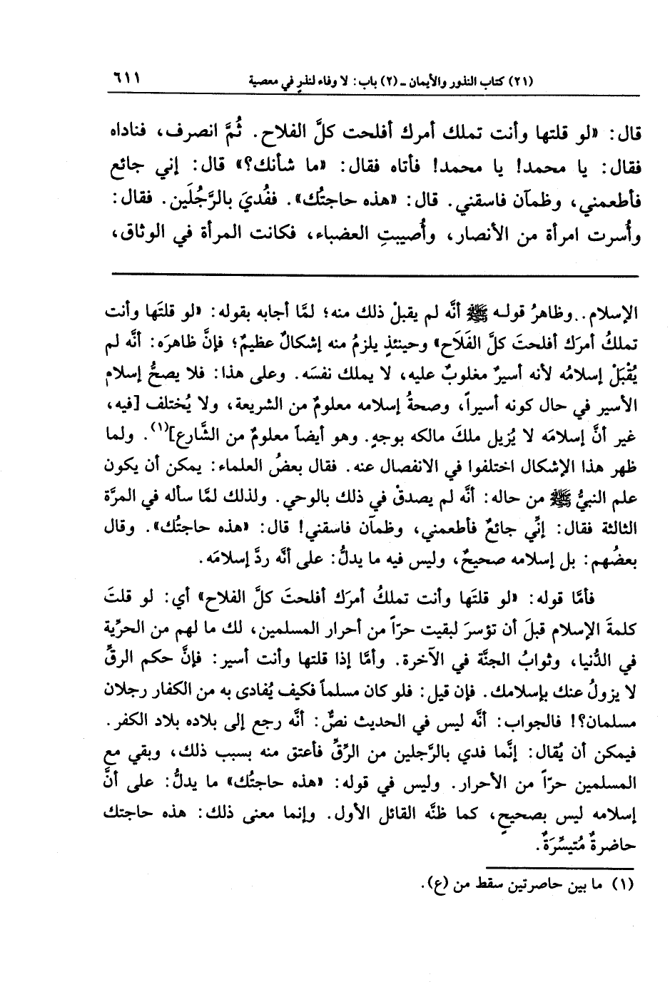 وظاهر قوله صلى الله عليه وسلم أنه لم يقبل ذلك منه؛ لما أجابه بقوله: (لو قلتها وأنت تملك أمرك أفلحت كل الفلاح)، وحينئذ يلزم منه إشكال عظيم؛ فإن ظاهره: أنه لم يقبل إسلامه لأنه أسيرٌ مغلوبٌ عليه، لا يملك نفسه. وعلى هذا: فلا يصح إسلام الأسير في حال كونه أسيرًا، وصحة إسلامه معلوم من الشريعة، ولا يختلف فيه، غير أن إسلامه لا يزيل ملك مالكه بوجه. وهو أيضًا معلوم من الشارع (¬1).