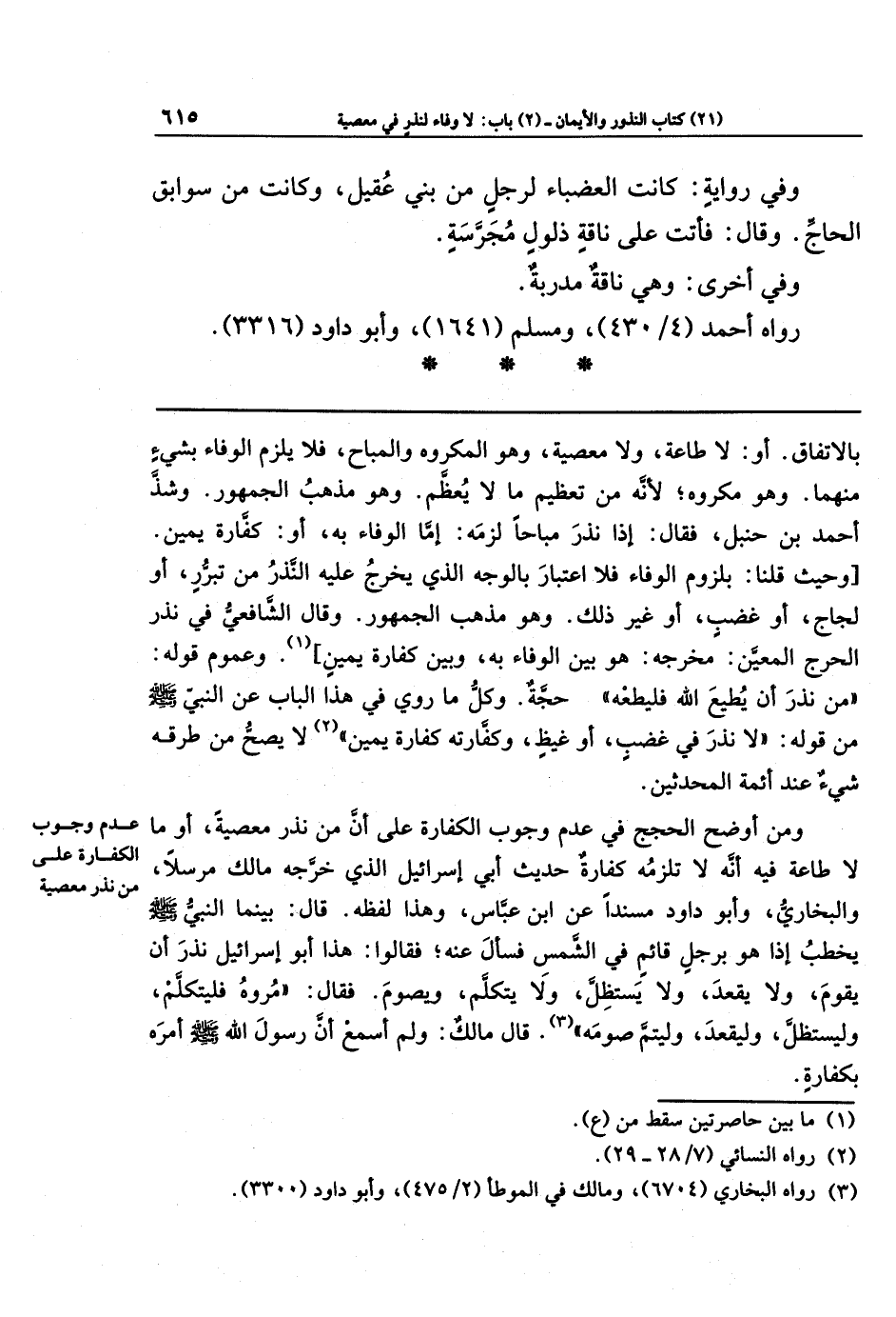 ومن أوضح الحجج في عدم وجوب الكفارة على أن من نذر معصية، أو ما لا طاعة فيه أنه لا تلزمه كفارة، حديث أبي إسرائيل الذي خرَّجه مالك مرسلًا، والبخاري، وأبو داود مسندًا عن ابن عبَّاس، وهذا لفظه: قال: بينما النبي صلى الله عليه وسلم يخطب إذا هو برجل قائم في الشمس فسأل عنه، فقالوا: هذا أبو إسرائيل نذر أن يقوم، ولا يقعد، ولا يستظل، ولا يتكلم، ويصوم. فقال: (مروه فليتكلم، وليستظل، وليقعد، وليتم صومه) (¬3). قال مالك: ولم أسمع أن رسول الله صلى الله عليه وسلم أمره بكفارة.