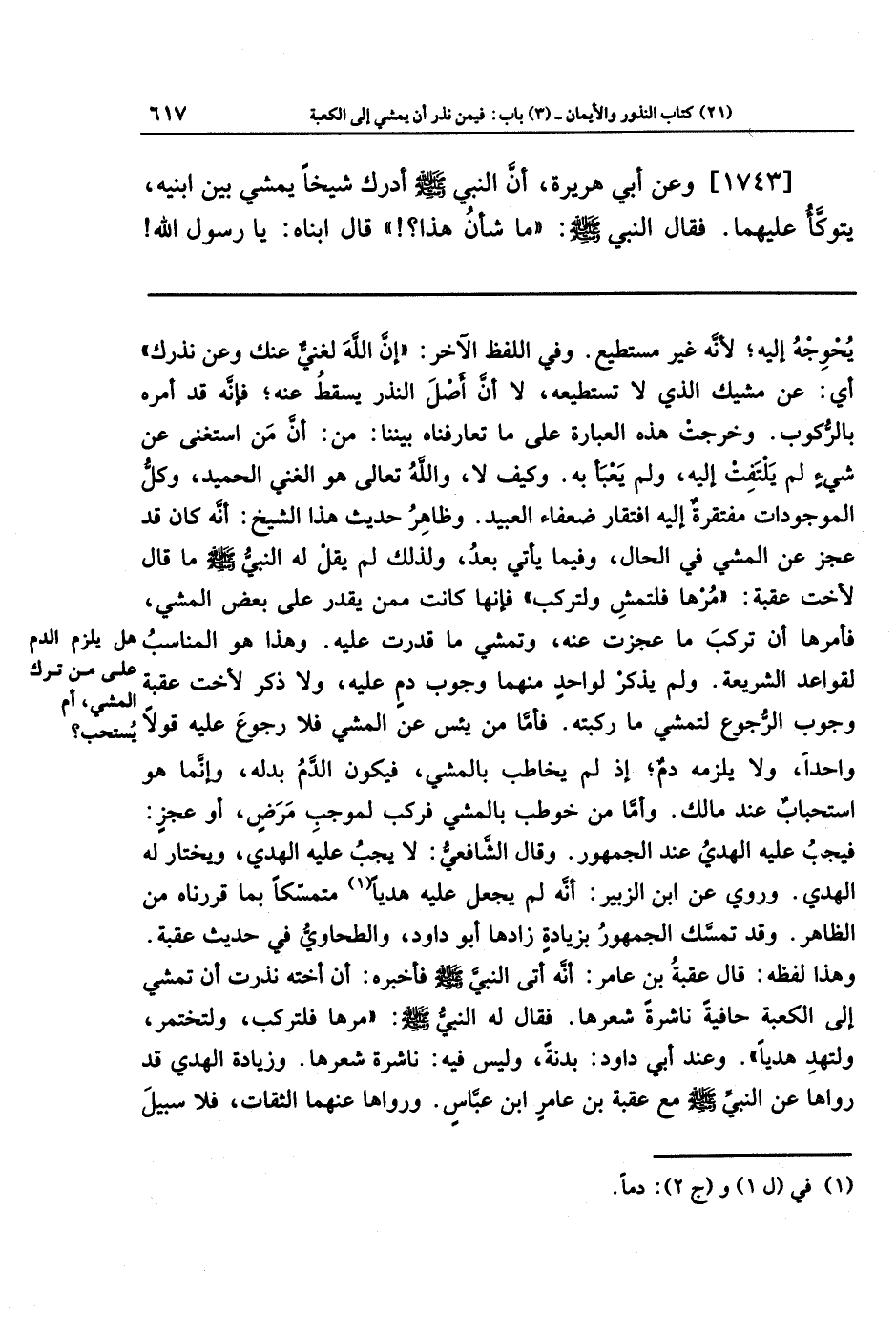 [1743] وعَن أَبِي هُرَيرَةَ: أَنَّ النَّبِيَّ صَلَّى اللَّهُ عَلَيهِ وَسَلَّمَ أَدرَكَ شَيخًا يَمشِي بَينَ ابنَيهِ يَتَوَكَّأُ عَلَيهِمَا، فَقَالَ النَّبِيُّ صَلَّى اللهُ عَلَيهِ وَسَلَّمَ: مَا شَأنُ هَذَا؟ قَالَ ابنَاهُ: يَا رَسُولَ اللَّهِ،