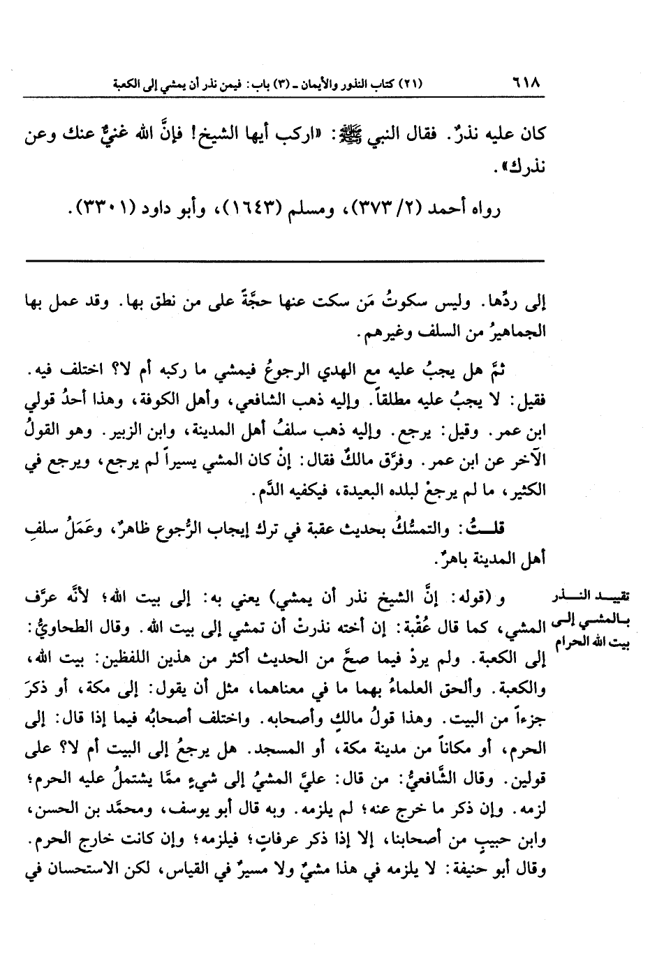 و(قوله: إن الشيخ نذر أن يمشي) يعني به: إلى بيت الله؛ لأنَّه عرَّف المشي، كما قال عقبة: إن أخ هـ نذرت أن تمشي إلى بيت الله. وقال الطحاوي: إلى الكعبة. ولم يرد فيما صحَّ من الحديث أكثر من هذين اللفظين: بيت الله، والكعبة. وألحق العلماء بهما ما في معناهما، مثل أن يقول: إلى مكة، أو ذكر جزءًا من البيت. وهذا قول مالك وأصحابه. واختلف أصحابه فيما إذا قال: إلى الحرم، ، أو مكانًا من مدينة مكة، أو المسجد. هل يرجع إلى البيت أم لا؟ على قولين. وقال الشافعي: من قال: عليَّ المشي إلى شيء مما يشتمل عليه الحرم؛ لزمه. وإن ذكر ما خرج عنه، لم يلزمه. وبه قال أبو يوسف، ومحمد بن الحسن، وابن حبيب من أصحابنا، إلا إذا ذكر عرفات؛ فيلزمه وإن كانت خارج الحرم. وقال أبو حنيفة: لا يلزمه في هذا مشي ولا مسير في القياس، لكن الاستحسان في