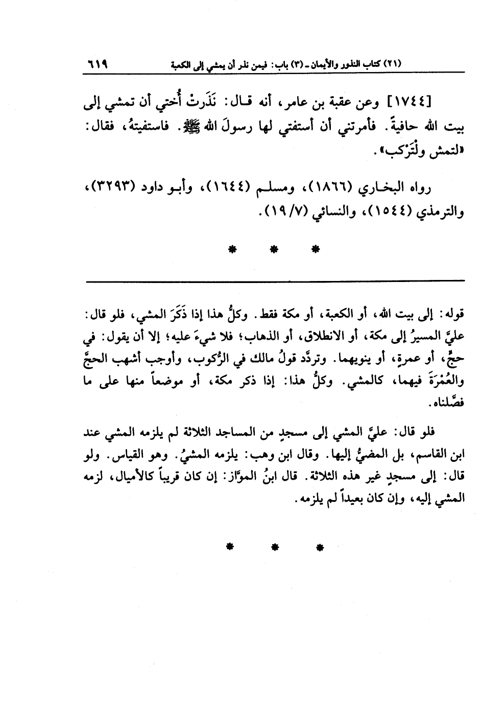 [1744] وعَن عُقبَةَ بنِ عَامِرٍ أَنَّهُ قَالَ: نَذَرَت أُختِي أَن تَمشِيَ إِلَى بَيتِ اللَّهِ حَافِيَةً، فَأَمَرَتنِي أَن أَستَفتِيَ لَهَا رَسُولَ اللَّهِ صَلَّى اللهُ عَلَيهِ وَسَلَّمَ، فَاستَفتَيتُهُ، فَقَالَ: لِتَمشِ وَلتَركَب.