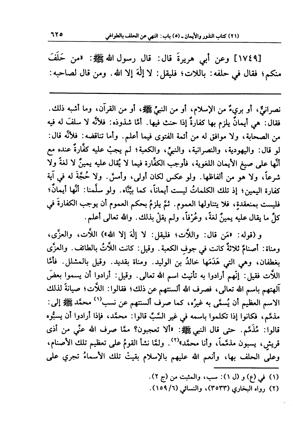 [1749] وعَن أَبي هُرَيرَةَ قَالَ: قَالَ رَسُولُ اللَّهِ صَلَّى اللهُ عَلَيهِ وَسَلَّمَ: مَن حَلَفَ مِنكُم فَقَالَ فِي حَلِفِهِ: بِاللَّاتِ، فَليَقُل: لَا إِلَهَ إِلَّا اللَّهُ، وَمَن قَالَ لِصَاحِبِهِ