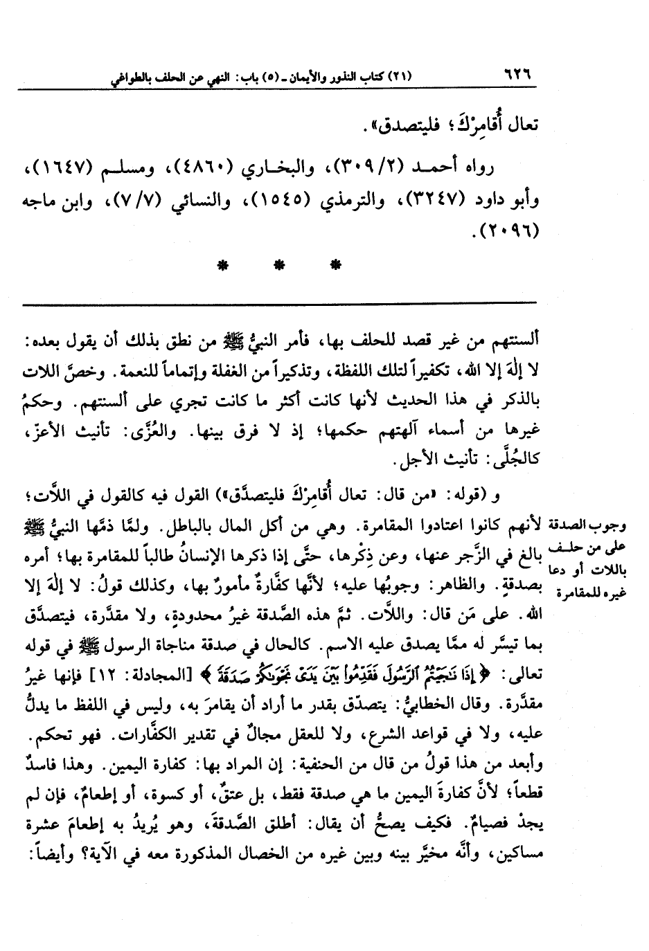 و(قوله: من قال: تعال أقامرُك فليتصدق) القول فيه كالقول في اللات؛ لأنهم كانوا اعتادوا المقامرة. وهي من أكل المال بالباطل. ولما ذمَّها النبي صلى الله عليه وسلم بالغ في الزجر عنها، وعن ذكرها، حتَّى إذا ذكرها الإنسان طالبًا للمقامرة بها؛ أمره بصدقة. والظاهر: وجوبها عليه؛ لأنها كفارةٌ مأمور بها، وكذلك قول: لا إله إلا الله؛ على من قال: واللات. ثم هذه الصَّدقة غير محدودة، ولا مقدَّرة، فيتصدق بما تيسَّر له مِمَّا يصدق عليه الاسم. كالحال في صدقة مناجاة الرسول صلى الله عليه وسلم في قوله تعالى: {إِذَا نَاجَيتُمُ الرَّسُولَ فَقَدِّمُوا بَينَ يَدَي نَجوَاكُم صَدَقَةً} فإنها غير مقدَّرة. وقال الخطابي: يتصدَّق بقدر ما أراد أن يقامر به، وليس في اللفظ ما يدل عليه، ولا في قواعد الشرع، ولا للعقل مجال في تقدير الكفارات. فهو تحكم. وأبعد من هذا قول من قال من الحنفية: إن المراد بها: كفارة اليمين. وهذا فاسد قطعًا؛ لأن كفارة اليمين ما هي صدقة فقط، بل عتق، أو كسوة، أو إطعام، فإن لم يجد فصيام. فكيف يصح أن يقال: أطلق الصدقة، وهو يريد به إطعام عشرة مساكين، وأنه مخيَّر بينه وبين غيره من الخصال المذكورة معه في الآية؛ وأيضًا: