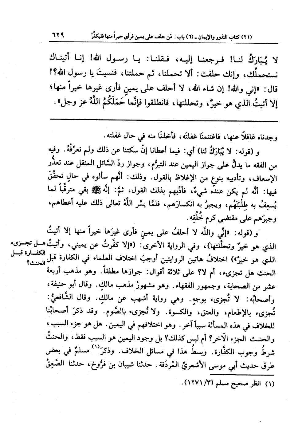 و(قوله: إني والله لا أحلف على يمين فأرى غيرها خيرًا منها إلا أتيت الذي هو خير وتحلَّلتها)، وفي الرواية الأخرى: (إلا كفَّرتُ عن يميني، وأتيت الذي هو خير) اختلاف هاتين الروايتين أوجب اختلاف العلماء في الكفارة قبل الحنث هل تجزئ أم لا؟ على ثلاثة أقوال: جوازها مطلقا. وهو مذهب أربعة عشر من الصحابة، وجمهور الفقهاء. وهو مشهور مذهب مالك. وقال أبو حنيفة وأصحابه: لا تجزئ بوجه. وهي رواية أشهب عن مالك. وقال الشافعي: تجزئ بالإطعام، والعتق، والكسوة. ولا تجزئ بالصَّوم. وقد ذكر أصحابنا للخلاف في هذه المسألة سببًا آخر. وهو اختلافهم في اليمين. هل هو جزء السبب، والحنث الجزء الآخر؟ أم ليس كذلك؟ بل وجود اليمين هو السبب فقط، والحنث شرط وجوب الكفارة. وبسط هذا في مسائل الخلاف.