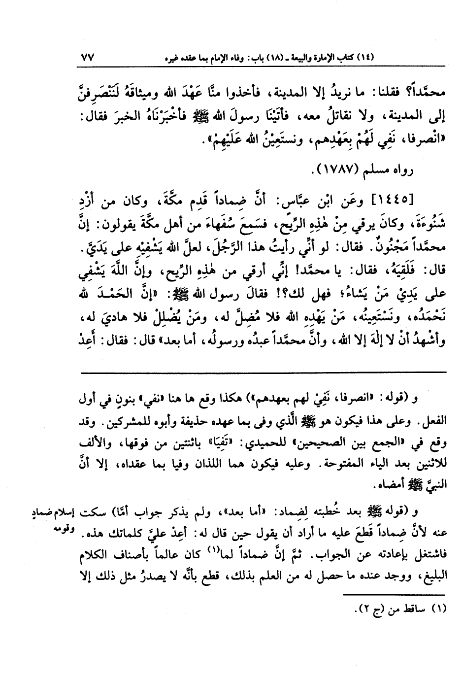 [1445] وعَن ابنِ عَبَّاسٍ أَنَّ ضِمَادًا قَدِمَ مَكَّةَ، وَكَانَ مِن أَزدِ شَنُوءَةَ، وَكَانَ يَرقِي مِن هَذِهِ الرِّيحِ، فَسَمِعَ سُفَهَاءَ مِن أَهلِ مَكَّةَ يَقُولُونَ: إِنَّ مُحَمَّدًا مَجنُونٌ! فَقَالَ: لَو أَنِّي رَأَيتُ هَذَا الرَّجُلَ لَعَلَّ اللَّهَ يَشفِيهِ عَلَى يَدَيَّ! قَالَ: فَلَقِيَهُ فَقَالَ: يَا مُحَمَّدُ، إِنِّي أَرقِي مِن هَذِهِ الرِّيحِ، وَإِنَّ اللَّهَ يَشفِي عَلَى يَدِي مَن يشَاءَ، فَهَل لَكَ؟ فَقَالَ رسول الله صَلَّى اللَّهُ عَلَيهِ وَسَلَّمَ: إِنَّ الحَمدَ لِلَّهِ، نَحمَدُهُ وَنَستَعِينُهُ، مَن يَهدِهِ اللَّهُ فَلَا مُضِلَّ لَهُ، وَمَن يُضلِل فَلَا هَادِيَ لَهُ، وَأَشهَدُ أَن لَا إِلَهَ إِلَّا اللَّهُ وَأَنَّ مُحَمَّدًا عَبدُهُ وَرَسُولُهُ، أَمَّا بَعدُ. قَالَ: فَقَالَ: أَعِد