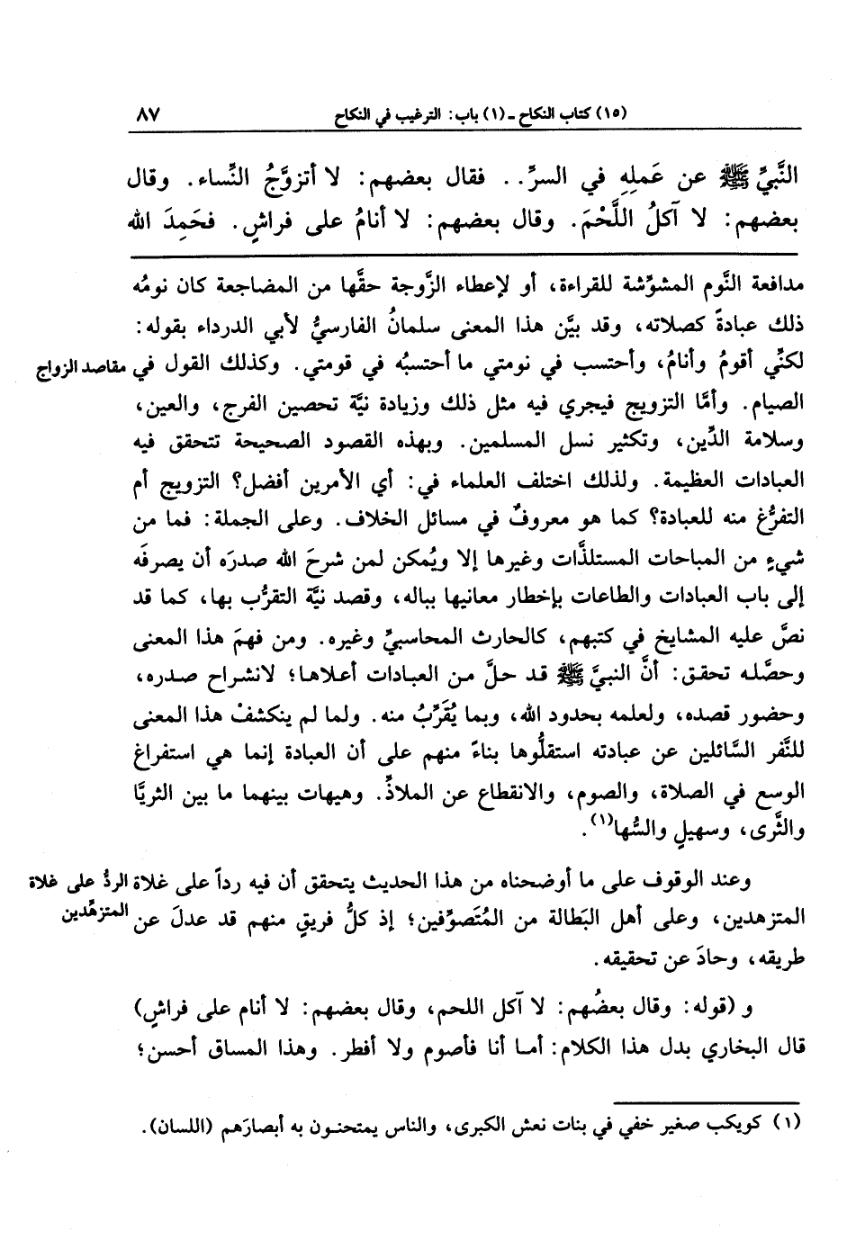 و(قوله: وقال بعضهم: لا آكل اللحم، وقال بعضهم: لا أنام على فراشٍ) قال البخاري بدل هذا الكلام: أما أنا فأصوم ولا أفطر. وهذا المساق أحسن؛