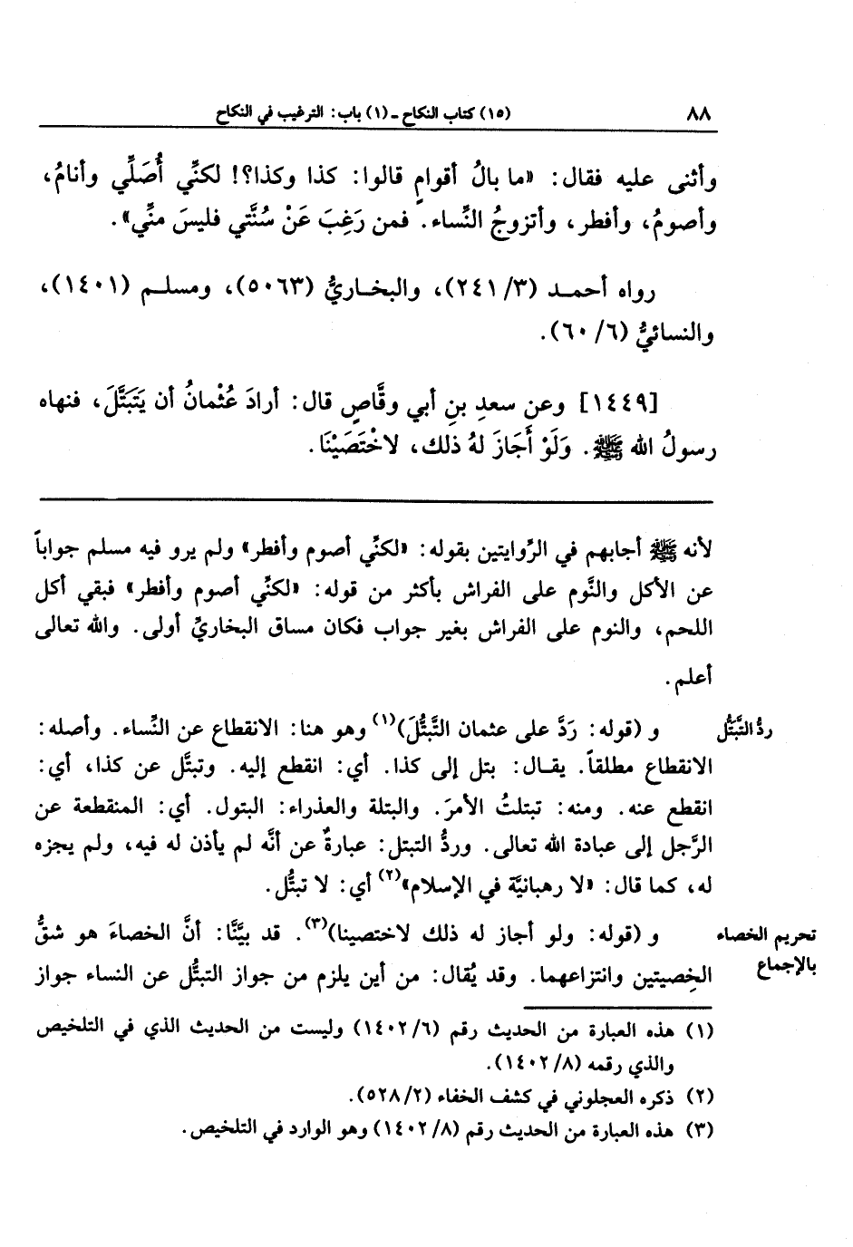 [1449] وعن سَعدَ بنَ أَبِي وَقَّاصٍ قُالُ: أَرَادَ عُثمَانُ أَن يَتَبَتَّلَ فَنَهَاهُ رسول الله صَلَّى اللَّهُ عَلَيهِ وَسَلَّمَ، وَلَو أَجَازَ لَهُ ذَلِكَ لَاختَصَينَا.