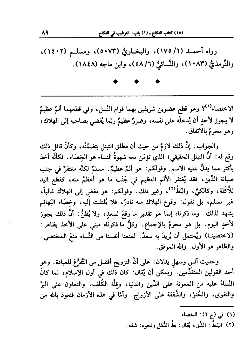 وحديث أنس وسهلٍ يدلان على أن التزويج أفضل من التفرغ للعبادة. وهو أحد القولين المتقدمين. ويمكن أن يقال: كان ذلك في أول الإسلام، لما كان النساء عليه من المعونة على الدِّين والدنيا، وقلة الكلف، والتعاون على البر والتقوى، والحنوّ، والشفقة على الأزواج. وأمَّا في هذه الأزمان فنعوذ بالله من