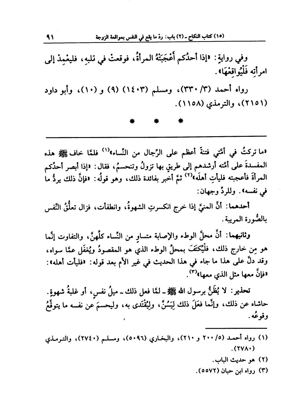 (ما تركت في أمتي فتنة أعظم على الرجال من النساء) (¬1) فلمّا خاف صلى الله عليه وسلم هذه المفسدة على أمته أرشدهم إلى طريق بها تزول وتنحسم، فقال: (إذا أبصر أحدكم المرأة فأعجبته فليأت أهله) (¬2) ثم أخبر بفائدة ذلك، وهو قوله: (فإن ذلك يردّ ما في نفسه). وللردّ وجهان: