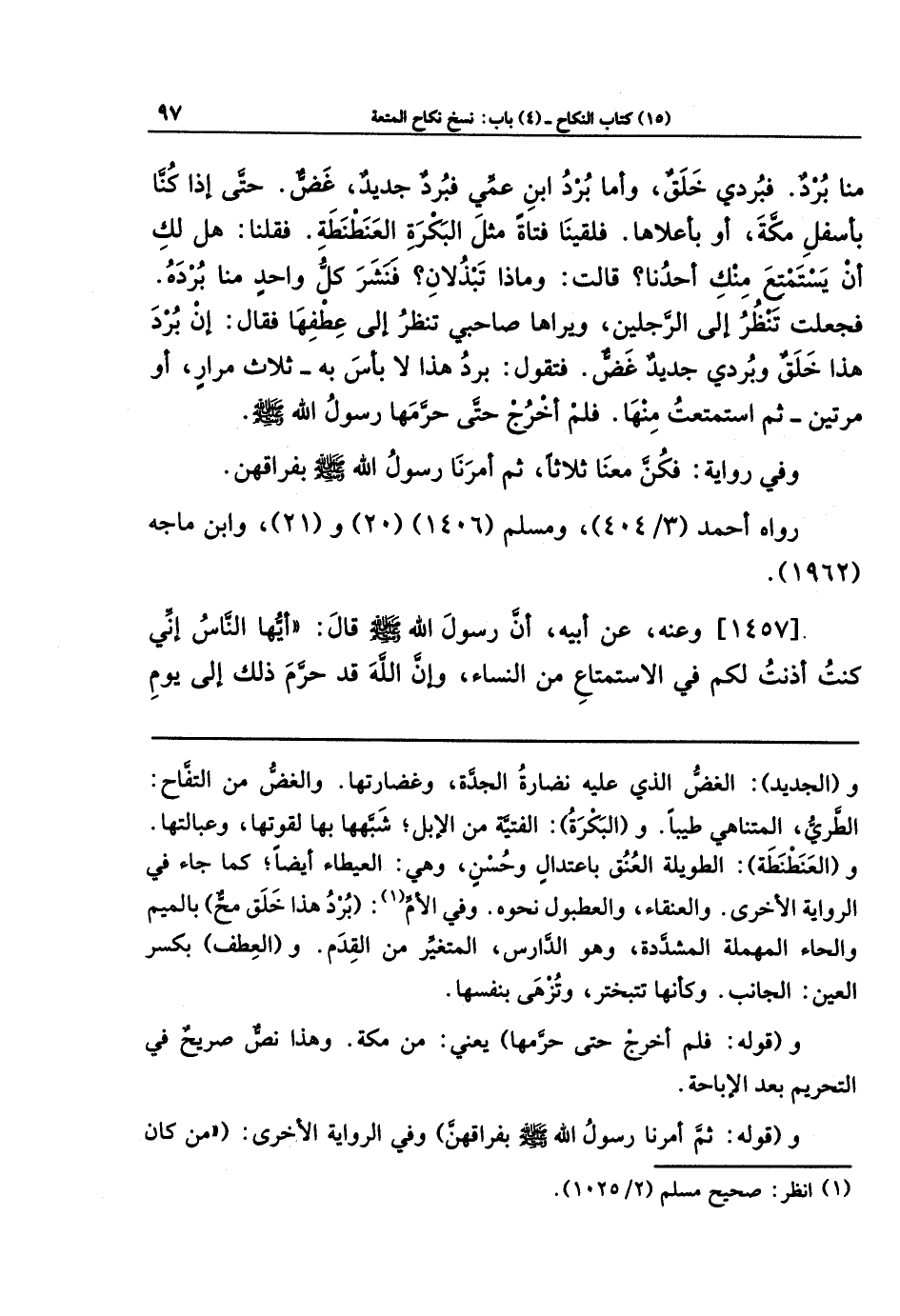 مِنَّا بُردٌ، فَبُردِي خَلَقٌ، وَأَمَّا بُردُ ابنِ عَمِّي فَبُردٌ جَدِيدٌ غَضٌّ، حَتَّى إِذَا كُنَّا بِأَسفَلِ مَكَّةَ (أَو بِأَعلَاهَا) فَلَقّينَا فَتَاةٌ مِثلُ البَكرَةِ العَنَطنَطَةِ فَقُلنَا: هَل لَكِ أَن يَستَمتِعَ مِنكِ أَحَدُنَا؟ قَالَت: وَمَاذَا تَبذُلَانِ؟ فَنَشَرَ كُلُّ وَاحِدٍ مِنَّا بُردَهُ، فَجَعَلَت تَنظُرُ إِلَى الرَّجُلَينِ، وَيَرَاهَا صَاحِبِي تَنظُرُ إِلَى عِطفِهَا فَقَالَ: إِنَّ بُردَ هَذَا خَلَقٌ، وَبُردِي جَدِيدٌ غَضٌّ فَتَقُولُ: بُردُ هَذَا لَا بَأسَ بِهِ ثَلَاثَ مِرَارٍ، أَو مَرَّتَينِ، ثُمَّ استَمتَعتُ مِنهَا، فَلَم أَخرُج حَتَّى حَرَّمَهَا رسول الله صَلَّى اللَّهُ عَلَيهِ وَسَلَّمَ.