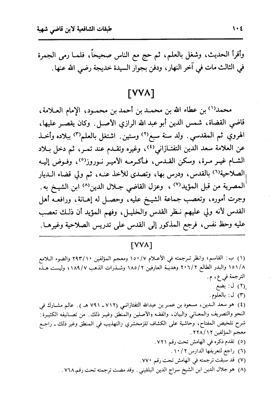778 - مُحَمَّد بن عَطاء الله بن مُحَمَّد بن أَحْمد بن مَحْمُود الإِمَام الْعَلامَة قَاضِي الْقُضَاة شمس الدَّين أَبُو عبد الله الرَّازِيّ الأَصْل وَكَانَ يقصر عَلَيْهَا الْهَرَوِيّ ثمَّ الْمَقْدِسِي ولد سنة سبع وَسِتِّينَ اشْتغل بِالْعلمِ ببلاده وَأخذ عَن الْعَلامَة سعد الدَّين التَّفْتَازَانِيّ وَغَيره وَتقدم عِنْد تمر ثمَّ دخل بِلَاد الشَّام غير مرّة وَسكن الْقُدس فَأكْرمه الْأَمِير نوروز وفوض إِلَيْهِ الصلاحية بالقدس ودرس بهَا وتصدى للأخذ عَنهُ ثمَّ ولي قَضَاء الديار المصرية من قبل الْمُؤَيد وعزل القَاضِي جلال الدَّين ابْن الشَّيْخ بِهِ وَجَرت أُمُوره وتعصب جمَاعَة الشَّيْخ عَلَيْهِ وَحصل لَهُ إهانة ورافعه أهل الْقُدس لِأَنَّهُ ولي عَلَيْهِم نظر الْقُدس والخليل وَفهم الْمُؤَيد أَن ذَلِك تعصب عَلَيْهِ وحظ نفس فَرجع الْمَذْكُور إِلَى الْقُدس على تدريس الصلاحية وَغَيرهَا