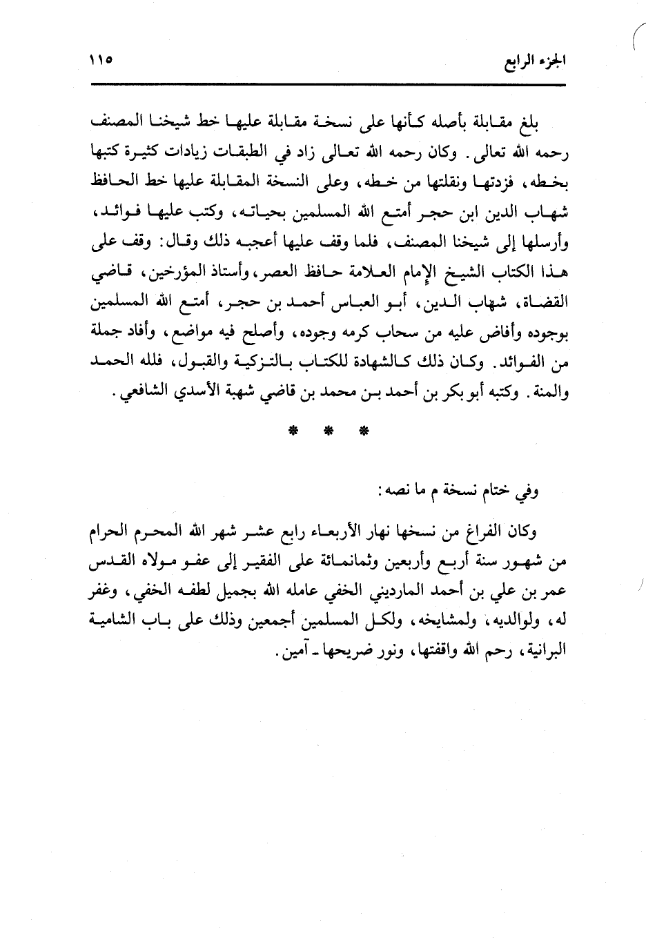 بلغ مُقَابلَة بِأَصْلِهِ كَأَنَّهَا على نُسْخَة مُقَابلَة عَلَيْهَا خطّ شَيخنَا المُصَنّف رَحمَه الله تَعَالَى وَكَانَ رَحمَه الله تَعَالَى زَاد فِي الطَّبَقَات زيادات كَثِيرَة كتبهَا بِخَطِّهِ فزدتها ونقلتها من خطه وعَلى النُّسْخَة الْمُقَابلَة عَلَيْهَا خطّ الْحَافِظ شهَاب الدَّين ابْن حجر أمتع الله الْمُسلمين بحياته وَكتب عَلَيْهَا فَوَائِد وأرسلها إِلَى شَيخنَا المُصَنّف فَلَمَّا وقف عَلَيْهَا أعجبه ذَلِك وَقَالَ وقف على هَذَا الْكتاب الشَّيْخ الإِمَام الْعَلامَة حَافظ الْعَصْر وأستاذ المؤرخين قَاضِي الْقُضَاة شهَاب الدَّين أَبُو الْعَبَّاس احْمَد بن حجر أمتع الله الْمُسلمين بِوُجُودِهِ وأفاض عَلَيْهِ من سَحَاب كرمه وجوده وَأصْلح فِيهِ مَوَاضِع وَأفَاد جملَة من الْفَوَائِد وَكَانَ ذَلِك كَالشَّهَادَةِ للْكتاب بالتزكية وَالْقَبُول فَللَّه الْحَمد والْمنَّة وَكتبه أَبُو بكر بن أَحْمد بن مُحَمَّد بن قَاضِي شُهْبَة الْأَسدي الشَّافِعِي