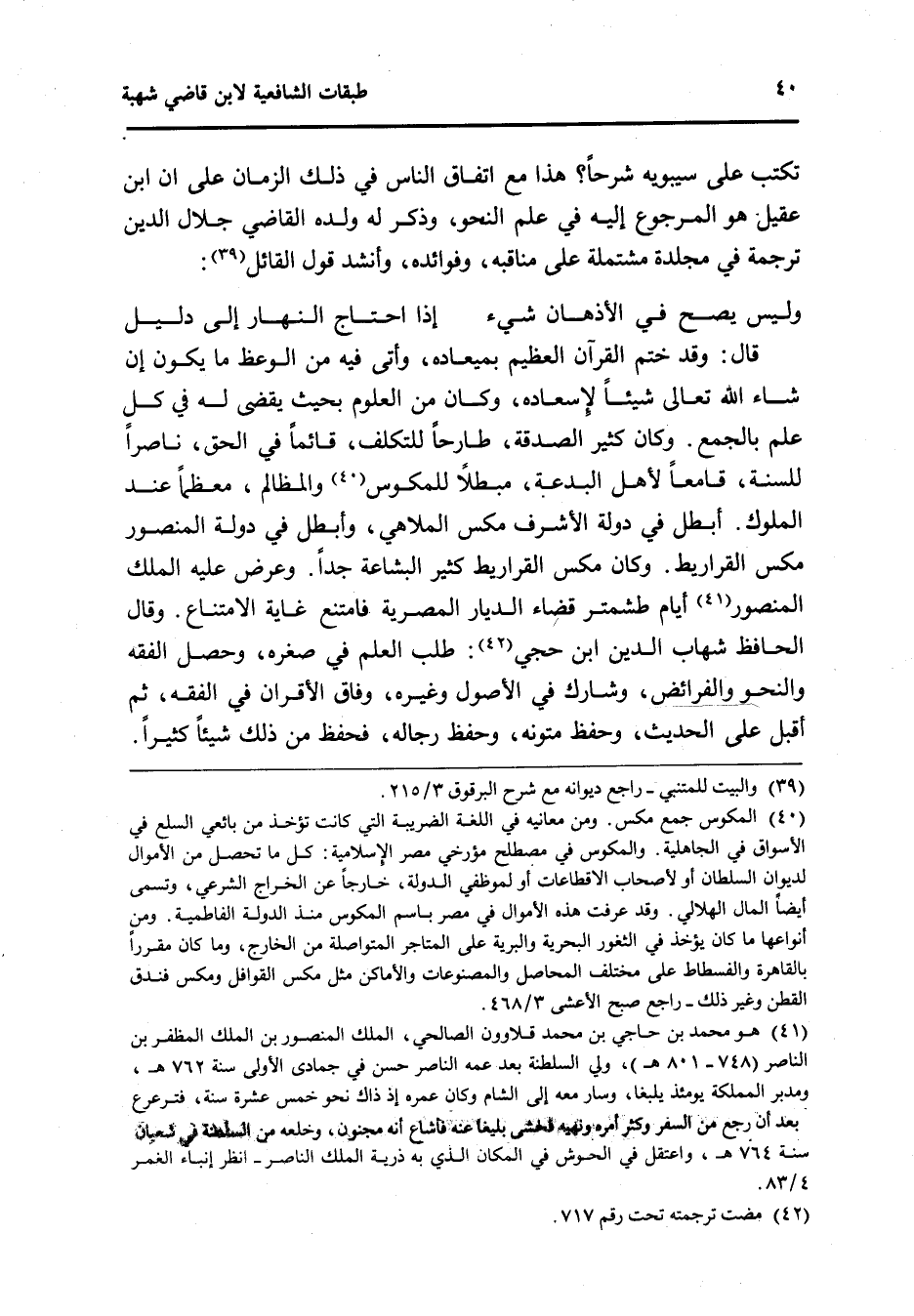 تكْتب على سِيبَوَيْهٍ شرحا هَذَا مَعَ اتِّفَاق النَّاس فِي ذَلِك الزَّمَان على ان ابْن عقيل هُوَ المرجوع إِلَيْهِ فِي علم النَّحْو وَذكر لَهُ وَلَده القَاضِي جلال الدَّين تَرْجَمَة فِي مجلدة مُشْتَمِلَة على مناقبه وفوائده وَأنْشد قَول الْقَائِل ... وَلَيْسَ يَصح فِي الأذهان شَيْء ... إِذا احْتَاجَ النَّهَار إِلَى دَلِيل ...