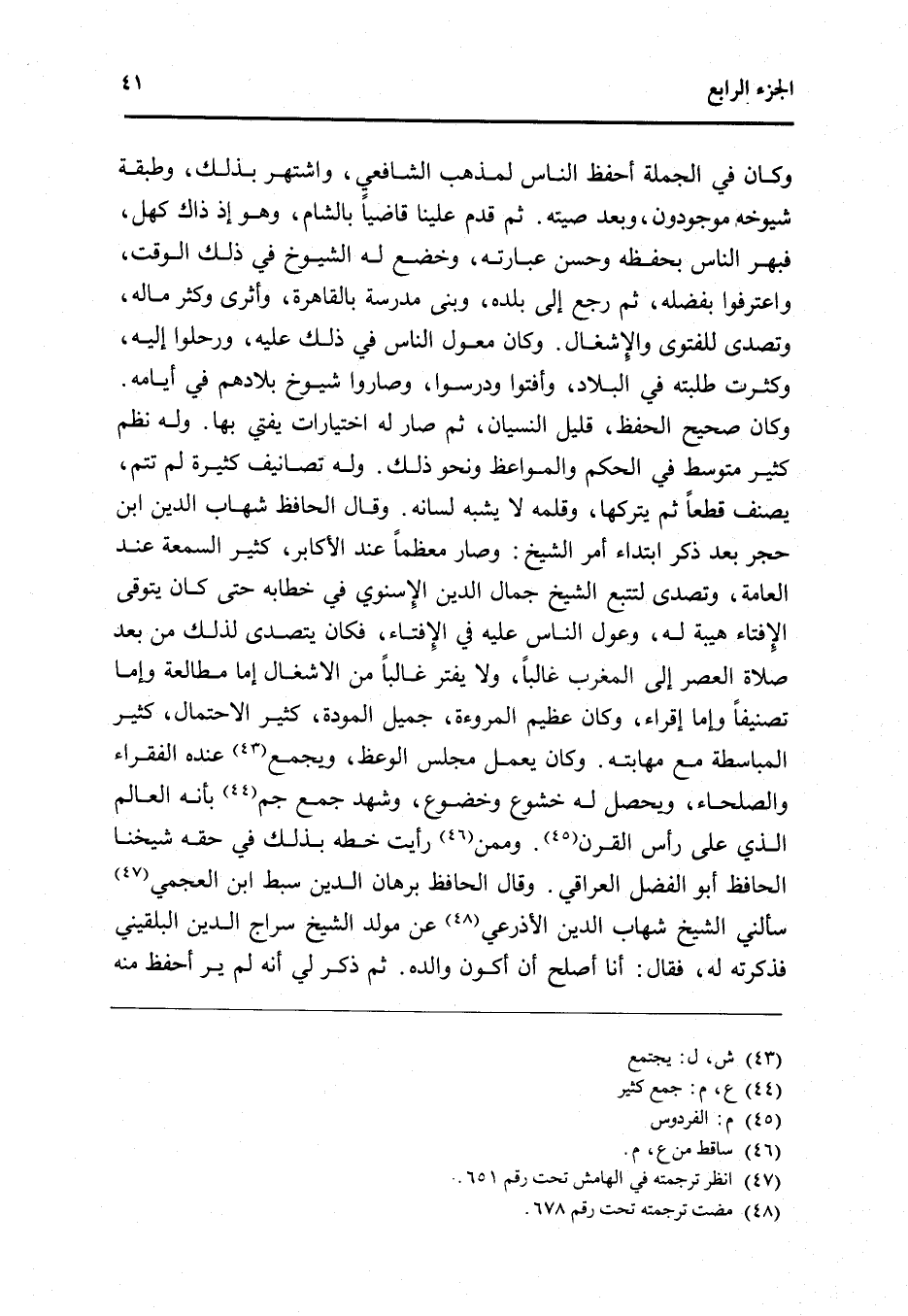 وَكَانَ فِي الْجُمْلَة أحفظ النَّاس لمَذْهَب الشَّافِعِي واشتهر بذلك وطبقة شُيُوخه موجودون وَبعد صيته ثمَّ قدم علينا قَاضِيا بِالشَّام وَهُوَ إِذْ ذَاك كهل فبهر النَّاس بحفظه وَحسن عِبَارَته وخضع لَهُ الشُّيُوخ فِي ذَلِك الْوَقْت واعترفوا بفضله ثمَّ رَجَعَ إِلَى بَلَده وَبنى مدرسة بِالْقَاهِرَةِ وأثرى وَكثر مَاله وتصدى للْفَتْوَى والإشغال وَكَانَ معول النَّاس فِي ذَلِك عَلَيْهِ ورحلوا إِلَيْهِ وَكثر طلبته فِي الْبِلَاد وأفتوا ودرسوا وصاروا شُيُوخ بِلَادهمْ فِي أَيَّامه وَكَانَ صَحِيح الْحِفْظ قَلِيل النسْيَان ثمَّ صَار لَهُ اختيارات يُفْتِي بهَا وَله نظم كثير متوسط فِي الحكم والمواعظ وَنَحْو ذَلِك وَله تصانيف كَثِيرَة لم تتمّ يصنف قطعا ثمَّ يَتْرُكهَا وقلمه لَا يشبه لِسَانه وَقَالَ الْحَافِظ شهَاب الدَّين ابْن حجر بعد ذكر ابْتِدَاء أَمر الشَّيْخ وَصَارَ مُعظما عِنْد الأكابر كثير السمعة عِنْد الْعَامَّة وتصدى لتتبع الشَّيْخ جمال الدَّين الْإِسْنَوِيّ فِي خطابه حَتَّى كَانَ يتوقى الْإِفْتَاء هَيْبَة لَهُ وعول النَّاس عَلَيْهِ فِي الْإِفْتَاء فَكَانَ يتَصَدَّى لذَلِك من بعد صَلَاة الْعَصْر إِلَى الْمغرب غَالِبا وَلَا يفتر غَالِبا من الاشغال إِمَّا مطالعة وَإِمَّا تصنيفا وَإِمَّا إقراء وَكَانَ عَظِيم الْمُرُوءَة جميل الْمَوَدَّة كثير الِاحْتِمَال كثير المباسطة مَعَ مهابته وَكَانَ يعْمل مجْلِس الْوَعْظ وَيجمع عِنْده الْفُقَرَاء والصلحاء وَيحصل لَهُ خشوع وخضوع وَشهد جمع جم بِأَنَّهُ الْعَالم الَّذِي على رَأس الْقرن وَمِمَّنْ رَأَيْت خطه بذلك فِي حَقه شَيخنَا الْحَافِظ أَبُو الْفضل الْعِرَاقِيّ وَقَالَ الْحَافِظ برهَان الدَّين سبط ابْن العجمي سَأَلَني الشَّيْخ شهَاب الدَّين الْأَذْرَعِيّ عَن مولد الشَّيْخ سراج الدَّين البُلْقِينِيّ فَذَكرته لَهُ فَقَالَ أَنا أصلح أَن أكون وَالِده ثمَّ ذكر لي أَنه لم ير أحفظ مِنْهُ