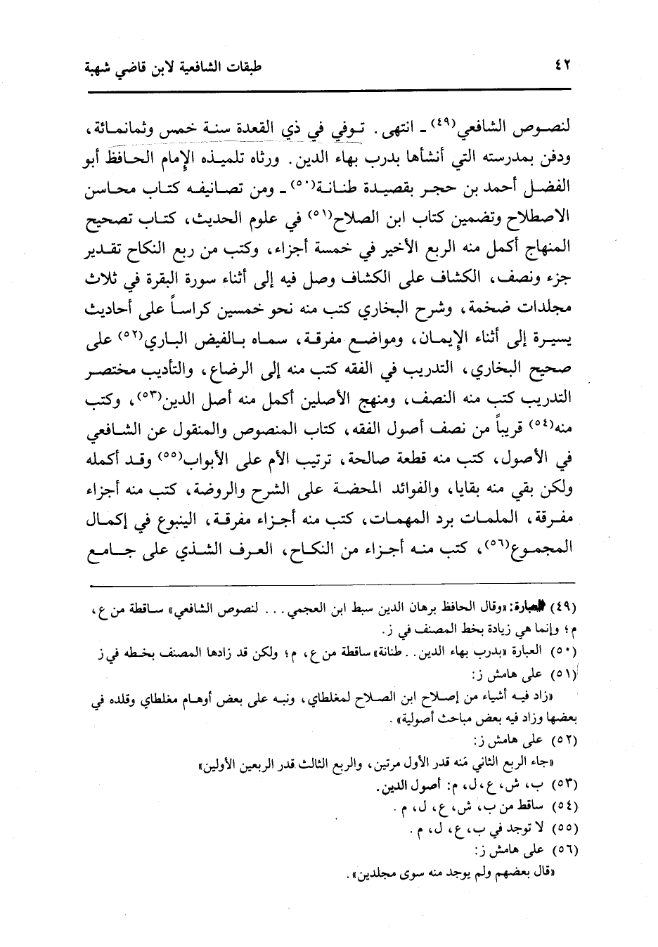 لنصوص الشَّافِعِي انْتهى توفّي فِي ذِي الْقعدَة سنة خمس وَثَمَانمِائَة وَدفن بمدرسته الَّتِي أَنْشَأَهَا بدرب بهاء الدَّين ورثاه تِلْمِيذه الإِمَام الْحَافِظ أَبُو الْفضل أَحْمد بن حجر بقصيدة طنانة وَمن تصانيفه كتاب محَاسِن الِاصْطِلَاح وتضمين كتاب ابْن الصّلاح فِي عُلُوم الحَدِيث كتاب تَصْحِيح الْمِنْهَاج أكمل مِنْهُ الرّبع الْأَخير فِي خَمْسَة أَجزَاء وَكتب من ربع النِّكَاح تَقْدِير جُزْء وَنصف الْكَشَّاف على الْكَشَّاف وصل فِيهِ إِلَى اثناء سُورَة الْبَقَرَة فِي ثَلَاث مجلدات ضخمة وَشرح البُخَارِيّ كتب مِنْهُ نَحْو خمسين كراسا على أَحَادِيث يسيرَة إِلَى أثْنَاء الْإِيمَان ومواضع مفرقة سَمَّاهُ بالفيض الْبَارِي على صَحِيح البُخَارِيّ التدريب فِي الْفِقْه كتب مِنْهُ إِلَى الرَّضَاع والتأديب مُخْتَصر التدريب كتب مِنْهُ النّصْف ومنهج الْأَصْلَيْنِ أكمل مِنْهُ أصل الدَّين وَكتب مِنْهُ قَرِيبا من نصف أصُول الْفِقْه كتاب الْمَنْصُوص وَالْمَنْقُول عَن الشَّافِعِي فِي الْأُصُول كتب مِنْهُ قِطْعَة صَالِحَة تَرْتِيب الْأُم على الْأَبْوَاب وَقد أكمله وَلَكِن بَقِي مِنْهُ بقايا والفوائد الْمَحْضَة على الشَّرْح وَالرَّوْضَة كتب مِنْهُ أَجزَاء مفرقة الملمات برد الْمُهِمَّات كتب مِنْهُ أَجزَاء مفرقه الينبوع فِي إِكْمَال الْمَجْمُوع كتب مِنْهُ أَجزَاء من النِّكَاح الْعرف الشذي على جَامع