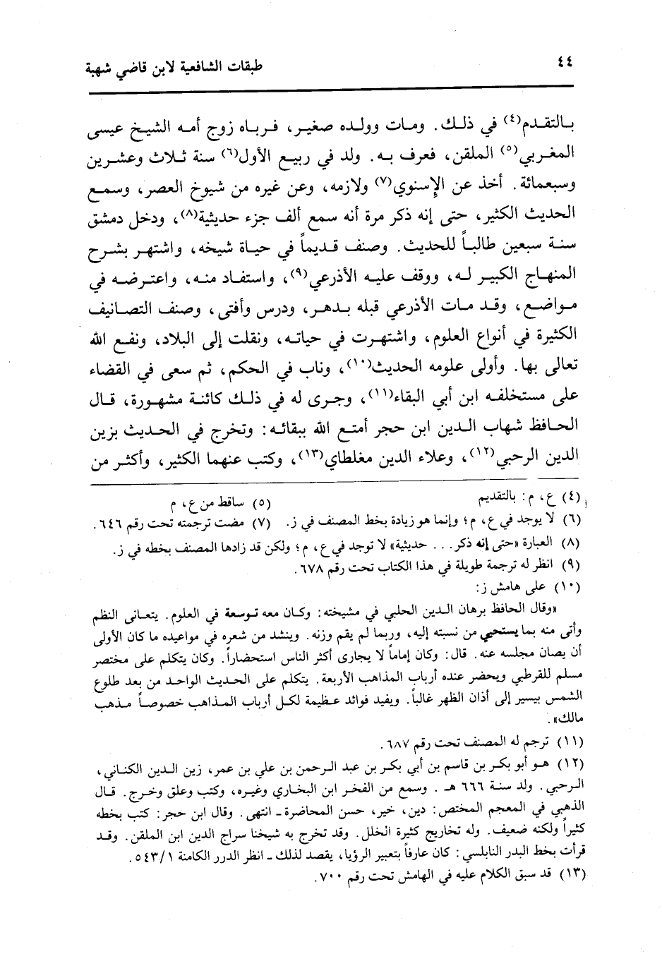 بالتقدم فِي ذَلِك وَمَات وَولده صَغِير فرباه زوج أمه الشَّيْخ عِيسَى المغربي الملقن فَعرف بِهِ ولد فِي ربيع الأول سنة ثَلَاث وَعشْرين وَسَبْعمائة أَخذ عَن الْإِسْنَوِيّ ولازمه وَعَن غَيره من شُيُوخ الْعَصْر وَسمع الحَدِيث الْكثير حَتَّى إِنَّه ذكر مرّة أَنه سمع ألف جُزْء حَدِيثِيَّةٌ وَدخل دمشق سنة سبعين طَالبا للْحَدِيث وصنف قَدِيما فِي حَيَاة شَيْخه واشتهر بشرح الْمِنْهَاج الْكَبِير لَهُ ووقف عَلَيْهِ الْأَذْرَعِيّ واستفاد مِنْهُ وَاعْتَرضهُ فِي مَوَاضِع وَقد مَاتَ الْأَذْرَعِيّ قبله بدهر ودرس وَأفْتى وصنف التصانيف الْكَثِيرَة فِي أَنْوَاع الْعُلُوم واشتهرت فِي حَيَاته ونقلت إِلَى الْبِلَاد ونفع الله تَعَالَى بهَا وَأولى علومه الحَدِيث وناب فِي الحكم ثمَّ سعى فِي الْقَضَاء على مستخلفه ابْن أبي الْبَقَاء وَجرى لَهُ فِي ذَلِك كائنة مَشْهُورَة قَالَ الْحَافِظ شهَاب الدَّين ابْن حجر أمتع الله بِبَقَائِهِ وَتخرج فِي الحَدِيث بزين الدَّين الرَّحبِي وعلاء الدَّين مغلطاي وَكتب عَنْهُمَا الْكثير وَأكْثر من
