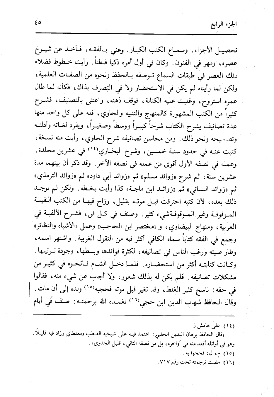 تَحْصِيل الْأَجْزَاء وَسَمَاع الْكتب الْكِبَار وعني بالفقه فَأخذ عَن شُيُوخ عصره وَمهر فِي الْفُنُون وَكَانَ فِي أول أمره ذكيا فطنا رَأَيْت خطوط فضلاء ذَلِك الْعَصْر فِي طَبَقَات السماع توصفه بِالْحِفْظِ وَنَحْوه من الصِّفَات العلمية وَلَكِن لما رَأَيْنَاهُ لم يكن فِي الاستحضار وَلَا فِي التَّصَرُّف بِذَاكَ فَكَأَنَّهُ لما طَال عمره استروح وغلبت عَلَيْهِ الْكِتَابَة فَوقف ذهنه واعتنى بالتصنيف فشرح كثيرا من الْكتب الْمَشْهُورَة كالمنهاج والتنبيه وَالْحَاوِي فَلهُ على كل وَاحِد مِنْهَا عدَّة تصانيف يشْرَح الْكتاب شرحا كَبِيرا ووسطا وصغيرا ويفرد لغاته وأدلته وتصحيحه وَنَحْو ذَلِك وَمن محَاسِن تصانيفه شرح الْحَاوِي رَأَيْت مِنْهُ نُسْخَة كتبت عَنهُ فِي حُدُود سنة خمسين وَشرح البُخَارِيّ فِي عشْرين مجلدة وَعَمله فِي نصفه الأول أقوى من عمله فِي نصف الآخر وَقد ذكر أَن بَينهمَا مُدَّة عشْرين سنة ثمَّ شرح زَوَائِد مُسلم ثمَّ زَوَائِد أبي دَاوُد ثمَّ زَوَائِد التِّرْمِذِيّ ثمَّ زَوَائِد النَّسَائِيّ ثمَّ زَوَائِد ابْن ماجة كَذَا رَأَيْت بِخَطِّهِ وَلَكِن لم يُوجد ذَلِك بعده لِأَن كتبه احترقت قبل مَوته بِقَلِيل وزاح فِيهَا من الْكتب النفيسة الْمَوْقُوفَة وَغير الْمَوْقُوفَة شَيْء كثير وصنف فِي كل فن فشرح الألفية فِي الْعَرَبيَّة ومنهاج الْبَيْضَاوِيّ ومختصر ابْن الْحَاجِب وَعمل الْأَشْبَاه والنظائر وَجمع فِي الْفِقْه كتابا سَمَّاهُ الْكَافِي أَكثر فِيهِ من النقول الغربية واشتهر اسْمه وطار صيته وَرغب النَّاس فِي تصانيفه لِكَثْرَة فوائدها وبسطها وجودة ترتيبها وَكَانَت كِتَابَته أَكثر من استحضاره فَلَمَّا دخل الشَّام فاتحوه فِي كثير من مشكلات تصانيفه فَلم يكن لَهُ بذلك شُعُور وَلَا أجَاب عَن شَيْء مِنْهُ فَقَالُوا فِي حَقه نَاسخ كثير الْغَلَط وَقد تغير قبل مَوته فحجبه وَلَده إِلَى أَن مَاتَ وَقَالَ الْحَافِظ شهَاب الدَّين ابْن حجي تغمده الله برحمته صنف فِي أَيَّام