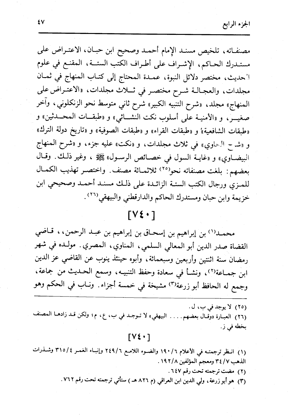 740 - مُحَمَّد بن إِبْرَاهِيم بن إِسْحَاق بن إِبْرَاهِيم بن عبد الرَّحْمَن قَاضِي الْقُضَاة صدر الدَّين أَبُو الْمَعَالِي السّلمِيّ الْمَنَاوِيّ الْمصْرِيّ مولده فِي شهر رَمَضَان سنة اثْنَتَيْنِ وَأَرْبَعين وَسَبْعمائة وَأَبوهُ حِينَئِذٍ يَنُوب عَن القَاضِي عز الدَّين ابْن جمَاعَة وَنَشَأ فِي سَعَادَة وَحفظ التَّنْبِيه وَسمع الحَدِيث من جمَاعَة وَجمع لَهُ الْحَافِظ أَبُو زرْعَة مشيخة فِي خَمْسَة أَجزَاء وناب فِي الحكم وَهُوَ