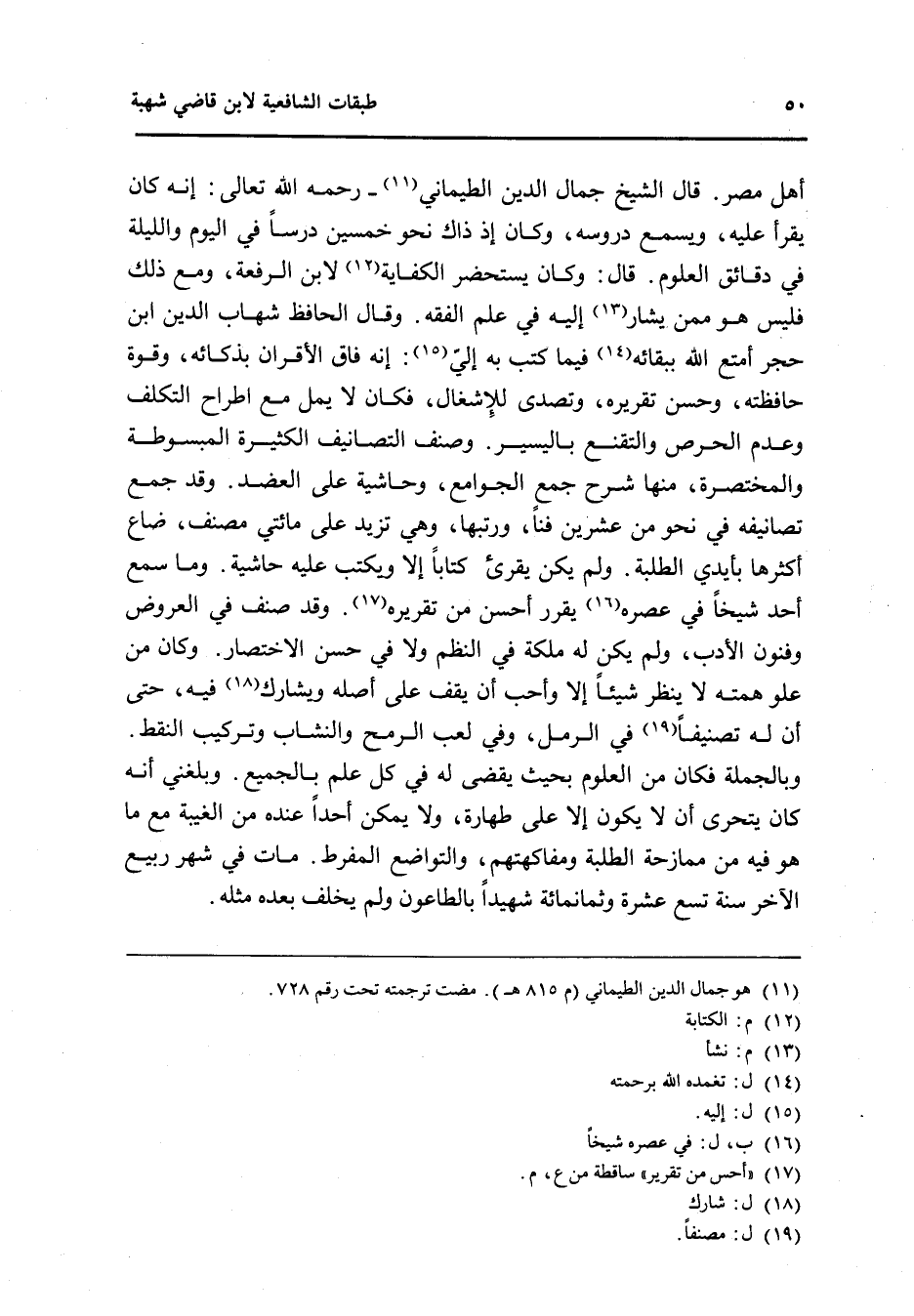 أهل مصر قَالَ الشَّيْخ جمال الدَّين الطيماني رَحمَه الله تَعَالَى إِنَّه كَانَ يقْرَأ عَلَيْهِ وَيسمع دروسه وَكَانَ إِذْ ذَاك نَحْو خمسين درسا فِي الْيَوْم وَاللَّيْلَة فِي دقائق الْعُلُوم قَالَ وَكَانَ يستحضر الْكِفَايَة لِابْنِ الرّفْعَة وَمَعَ ذَلِك فَلَيْسَ هُوَ مِمَّن يشار إِلَيْهِ فِي علم الْفِقْه وَقَالَ الْحَافِظ شهَاب الدَّين ابْن حجر أمتع الله بِبَقَائِهِ فِيمَا كتب بِهِ إِلَيّ إِنَّه فاق الأقران بذكائه وَقُوَّة حافظته وَحسن تَقْرِيره وتصدى للإشغال فَكَانَ لَا يمل مَعَ اطراح التَّكَلُّف وَعدم الْحِرْص والتقنع باليسير وصنف التصانيف الْكَثِيرَة المبسوطة والمختصرة مِنْهَا شرح جمع الْجَوَامِع وحاشية على الْعَضُد وَقد جمع تصانيفه فِي نَحْو من عشْرين فَنًّا ورتبها وَهِي تزيد على مِائَتي مُصَنف ضَاعَ أَكْثَرهَا بأيدي الطّلبَة وَلم يكن يقرىء كتابا إِلَّا وَيكْتب عَلَيْهِ حَاشِيَة وَمَا سمع أحد شَيخا فِي عصره يُقرر أحسن من تَقْرِيره وَقد صنف فِي الْعرُوض وفنون الْأَدَب وَلم يكن لَهُ ملكة فِي النّظم وَلَا فِي حسن الِاخْتِصَار وَكَانَ من علو همته لَا ينظر شَيْئا إِلَّا وَأحب أَن يقف على أَصله ويشارك فِيهِ حَتَّى أَن لَهُ تصنيفا فِي الرمل وَفِي لعب الرمْح والنشاب وتركيب النقط وَبِالْجُمْلَةِ فَكَانَ من الْعُلُوم بِحَيْثُ يقْضى لَهُ فِي كل علم بِالْجَمِيعِ وَبَلغنِي أَنه كَانَ يتحَرَّى أَن لَا يكون إِلَّا على طَهَارَة وَلَا يُمكن أحدا عِنْده من الْغَيْبَة مَعَ مَا هُوَ فِيهِ من ممازحة الطّلبَة ومفاكهتهم والتواضع المفرط مَاتَ فِي شهر ربيع الآخر سنة تسع عشرَة وَثَمَانمِائَة شَهِيدا بالطاعون وَلم يخلف بعده مثله