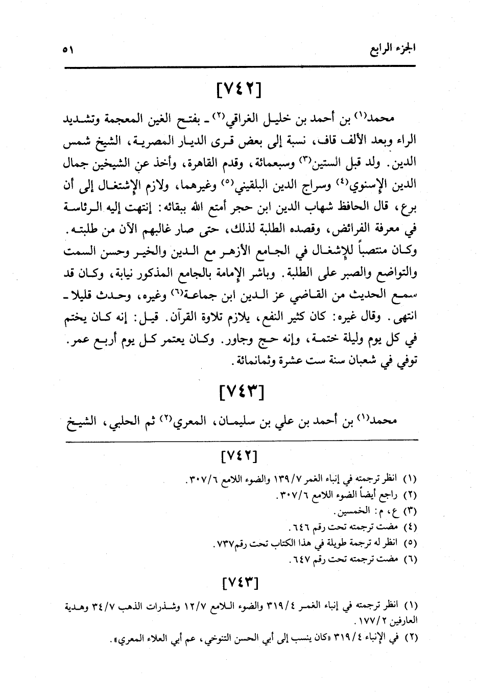 - مُحَمَّد بن أَحْمد بن خَلِيل الغراقي بِفَتْح الْغَيْن الْمُعْجَمَة وَتَشْديد الرَّاء وَبعد الْألف قَاف نِسْبَة إِلَى بعض قرى الديار المصرية الشَّيْخ شمس الدَّين ولد قبل السِّتين وَسَبْعمائة وَقدم الْقَاهِرَة وَأخذ عَن الشَّيْخَيْنِ جمال الدَّين الْإِسْنَوِيّ وسراج الدَّين البُلْقِينِيّ وَغَيرهمَا ولازم الإشتغال إِلَى أَن برع قَالَ الْحَافِظ شهَاب الدَّين ابْن حجر أمتع الله بِبَقَائِهِ إنتهت إِلَيْهِ الرِّئَاسَة فِي معرفَة الْفَرَائِض وقصده الطّلبَة لذَلِك حَتَّى صَار غالبهم الْآن من طلبته وَكَانَ منتصبا للإشغال فِي الْجَامِع الْأَزْهَر مَعَ الدَّين وَالْخَيْر وَحسن السمت والتواضع وَالصَّبْر على الطّلبَة وباشر الْإِمَامَة بالجامع الْمَذْكُور نِيَابَة وَكَانَ قد سمع الحَدِيث من القَاضِي عز الدَّين ابْن جمَاعَة وَغَيره وَحدث قَلِيلا انْتهى وَقَالَ غَيره كَانَ كثير النَّفْع يلازم تِلَاوَة الْقُرْآن قيل إِنَّه كَانَ يخْتم فِي كل يَوْم وَلَيْلَة ختمة وَإنَّهُ حج وجاور وَكَانَ يعْتَمر كل يَوْم أَربع عمر توفّي فِي شعْبَان سنة سِتّ عشرَة وَثَمَانمِائَة