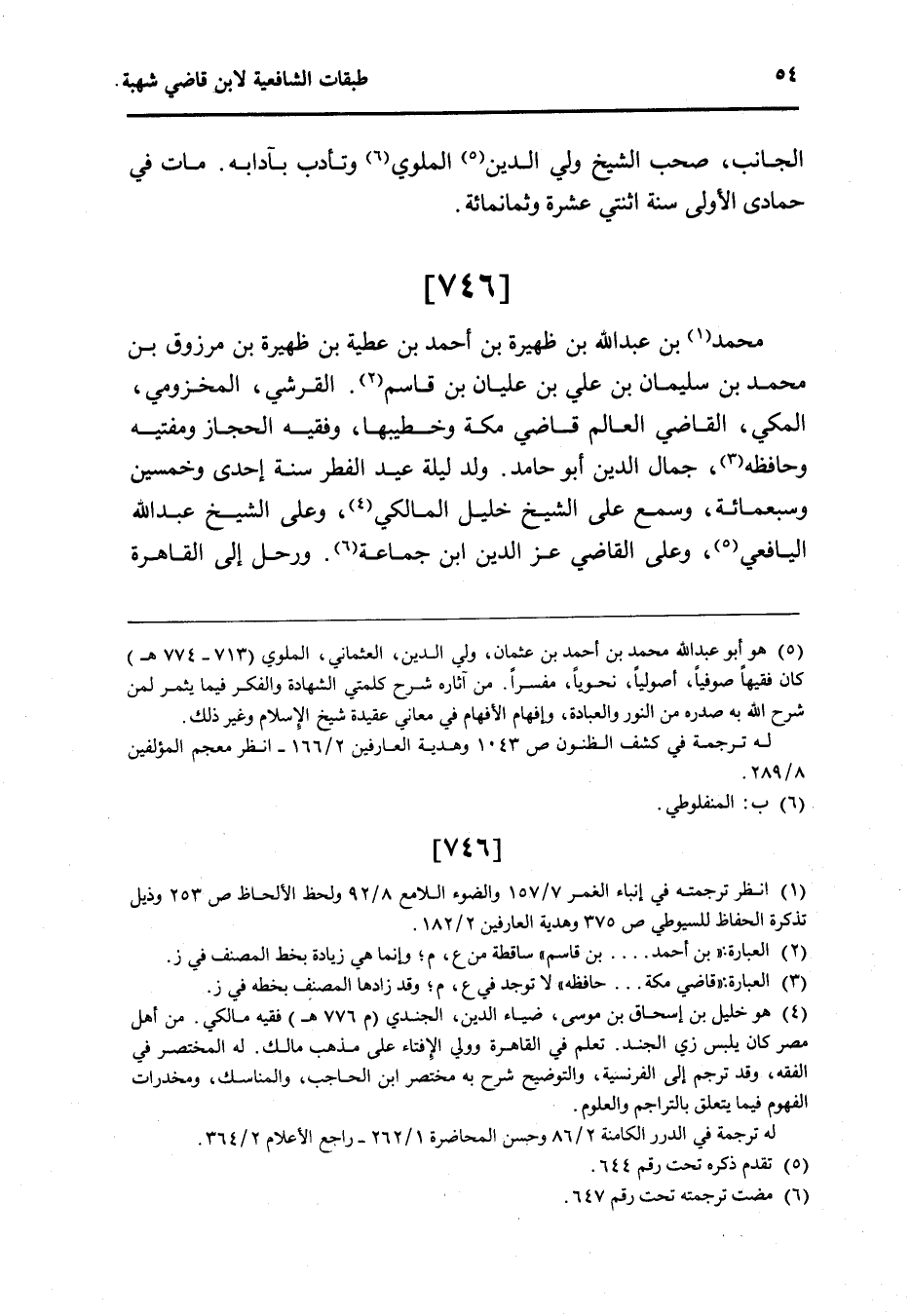 746 - مُحَمَّد بن عبد الله بن ظهيرة بن أَحْمد بن عَطِيَّة بن ظهيرة بن مَرْزُوق بن مُحَمَّد بن سُلَيْمَان بن عَليّ بن عليان بن قَاسم الْقرشِي المَخْزُومِي الْمَكِّيّ القَاضِي الْعَالم قَاضِي مَكَّة وخطيبها وفقيه الْحجاز ومفتيه وحافظه جمال الدَّين أَبُو حَامِد ولد لَيْلَة عيد الْفطر سنة إِحْدَى وَخمسين وَسَبْعمائة وَسمع على الشَّيْخ خَلِيل الْمَالِكِي وعَلى الشَّيْخ عبد الله اليافعي وعَلى القَاضِي عز الدَّين ابْن جمَاعَة ورحل إِلَى الْقَاهِرَة