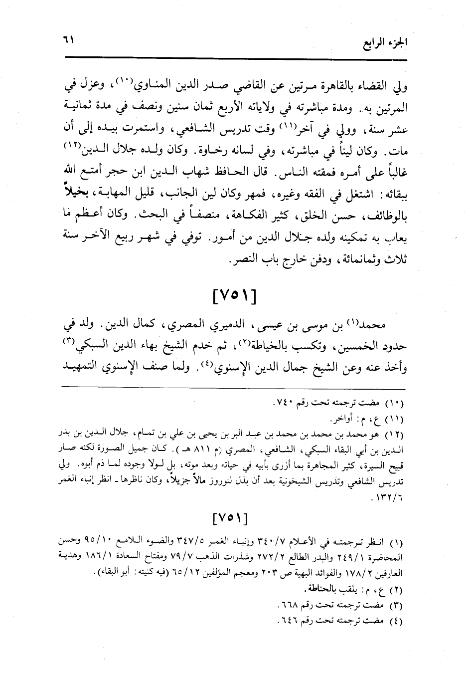751 - مُحَمَّد بن مُوسَى بن عِيسَى الدَّمِيرِيّ الْمصْرِيّ كَمَال الدَّين ولد فِي حُدُود الْخمسين وتكسب بالخياطة ثمَّ خدم الشَّيْخ بهاء الدَّين السُّبْكِيّ وَأخذ عَنهُ وَعَن الشَّيْخ جمال الدَّين الْإِسْنَوِيّ وَلما صنف الْإِسْنَوِيّ التَّمْهِيد
