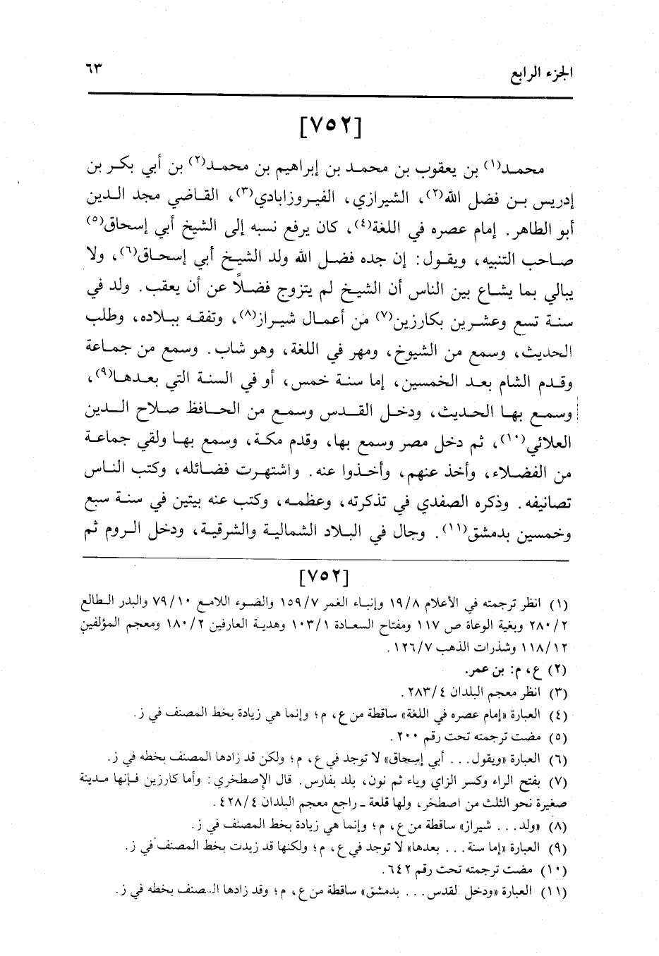 752 - مُحَمَّد بن يَعْقُوب بن مُحَمَّد بن إِبْرَاهِيم بن مُحَمَّد بن أبي بكر بن إِدْرِيس بن فضل الله الشِّيرَازِيّ الفيروزابادي القَاضِي مجد الدَّين أَبُو الطَّاهِر إِمَام عصره فِي اللُّغَة كَانَ يرفع نسبه إِلَى الشَّيْخ أبي إِسْحَاق صَاحب التَّنْبِيه وَيَقُول إِن جده فضل الله ولد الشَّيْخ أبي إِسْحَاق وَلَا يُبَالِي بِمَا يشاع بَين النَّاس أَن الشَّيْخ لم يتَزَوَّج فضلا عَن أَن يعقب ولد فِي سنة تسع وَعشْرين بكارزين من أَعمال شيراز وتفقه ببلاده وَطلب الحَدِيث وَسمع من الشُّيُوخ وَمهر فِي اللُّغَة وَهُوَ شَاب وَسمع من جمَاعَة وَقدم الشَّام بعد الْخمسين إِمَّا سنة خمس أَو فِي السّنة الَّتِي بعْدهَا وَسمع بهَا الحَدِيث وَدخل الْقُدس وَسمع من الْحَافِظ صَلَاح الدَّين العلائي ثمَّ دخل مصر وَسمع بهَا وَقدم مَكَّة وَسمع بهَا وَلَقي جمَاعَة من الْفُضَلَاء وَأخذ عَنْهُم وَأخذُوا عَنهُ واشتهرت فضائله وَكتب النَّاس تصانيفه وَذكره الصَّفَدِي فِي تَذكرته وعظمه وَكتب عَنهُ بَيْتَيْنِ فِي سنة سبع وَخمسين بِدِمَشْق وجال فِي الْبِلَاد الشمالية والشرقية وَدخل الرّوم ثمَّ