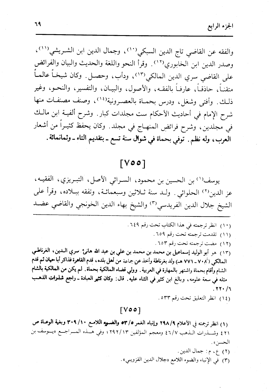 755 - يُوسُف بن الْحُسَيْن بن مَحْمُود السرائى الأَصْل التبريزي الْفَقِيه عز الدَّين الحلوائي ولد سنة ثَلَاثِينَ وَسَبْعمائة وتفقه ببلاده وَقَرَأَ على الشَّيْخ جلال الدَّين الفريدسي وَالشَّيْخ بهاء الدَّين الخونجي وَالْقَاضِي عضد