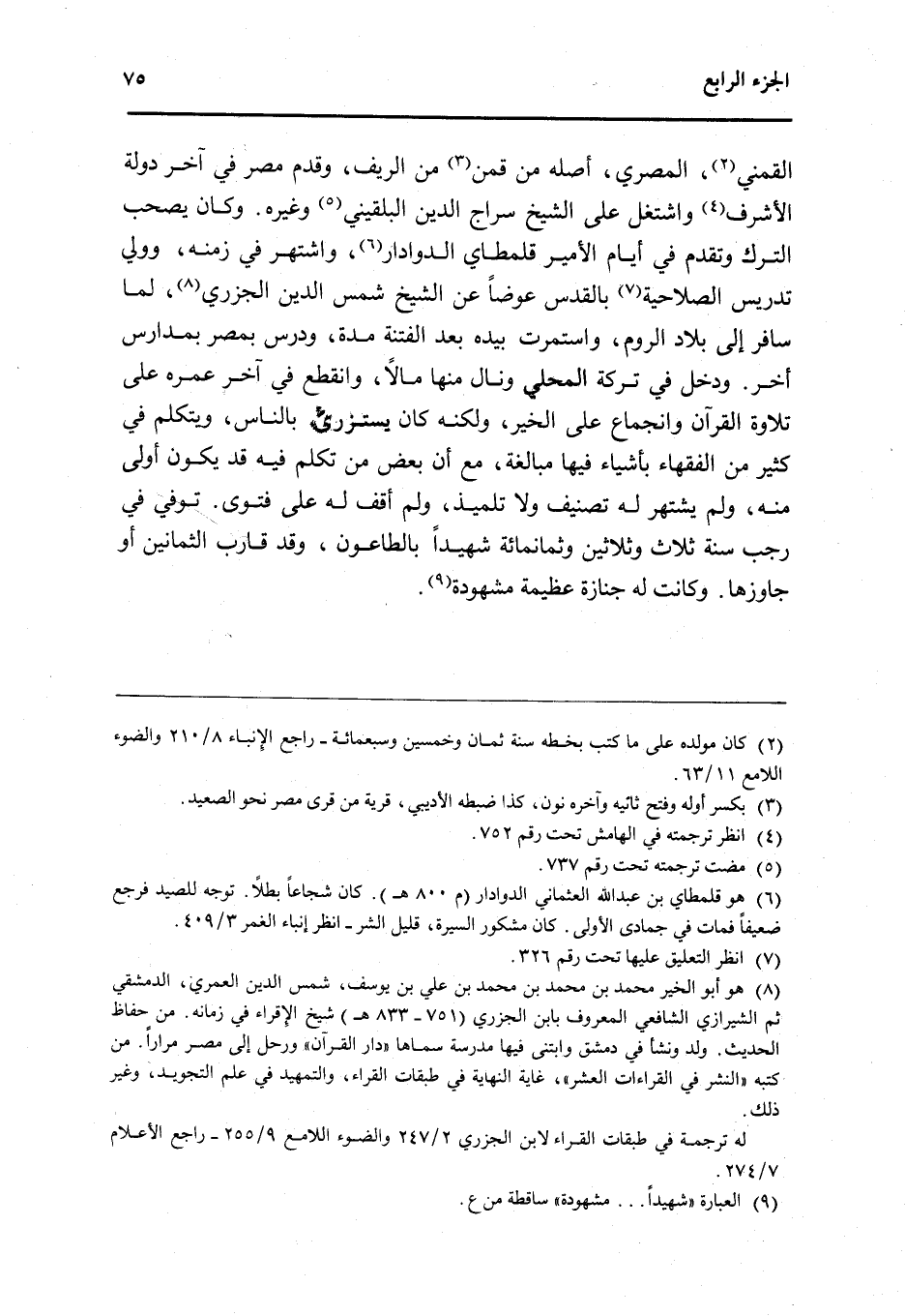 القمني الْمصْرِيّ أَصله من قمن من الرِّيف وَقدم مصر فِي آخر دولة الْأَشْرَف واشتغل على الشَّيْخ سراج الدَّين البُلْقِينِيّ وَغير وَكَانَ يصحب التّرْك وَتقدم فِي أَيَّام الْأَمِير قلمطاي الدوادار واشتهر فِي زَمَنه وَولي تدريس الصلاحية بالقدس عوضا عَن الشَّيْخ شمس الدَّين الْجَزرِي لما سَافر إِلَى بِلَاد الرّوم واستمرت بِيَدِهِ بعد الْفِتْنَة مُدَّة ودرس بِمصْر بمدارس أخر وَدخل فِي تَرِكَة الْمحلي ونال مِنْهَا مَالا وَانْقطع فِي آخر عمره على تِلَاوَة الْقُرْآن وانجماع على الْخَيْر وَلكنه كَانَ يستزرىء بِالنَّاسِ وَيتَكَلَّم فِي كثير من الْفُقَهَاء بأَشْيَاء فِيهَا مُبَالغَة مَعَ أَن بعض من تكلم فِيهِ قد يكون أولى مِنْهُ وَلم يشْتَهر لَهُ تصنيف وَلَا تلميذ وَلم أَقف لَهُ على فَتْوَى توفّي فِي رَجَب سنة ثَلَاث وَثَلَاثِينَ وَثَمَانمِائَة شَهِيدا بالطاعون وَقد قَارب الثَّمَانِينَ أَو جاوزها وَكَانَت لَهُ جَنَازَة عَظِيمَة مَشْهُودَة