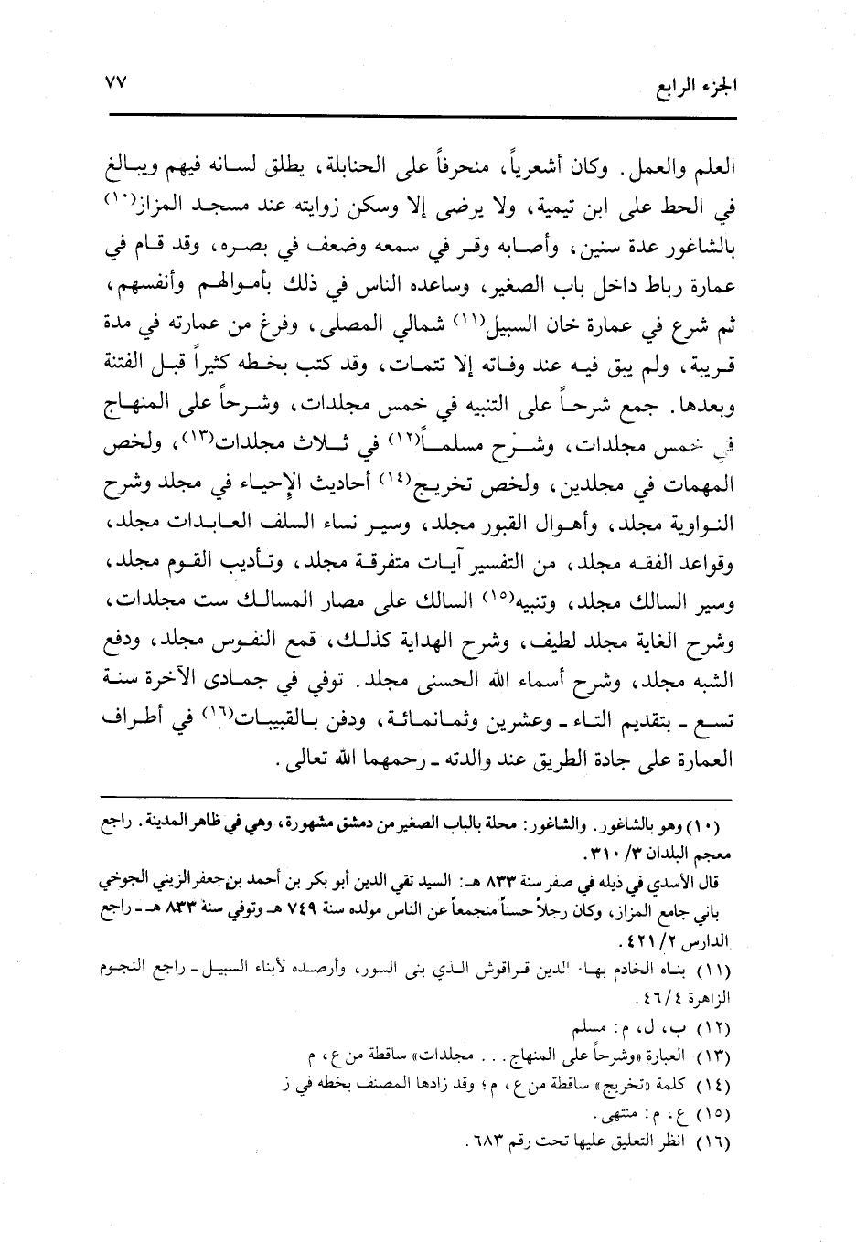 الْعلم وَالْعَمَل وَكَانَ أشعريا منحرفا على الْحَنَابِلَة يُطلق لِسَانه فيهم ويبالغ فِي الْحَط على ابْن تَيْمِية وَلَا يرضى إِلَّا وَسكن زوايته عِنْد مَسْجِد المزاز بالشاغور عدَّة سِنِين وأصابه وقر فِي سَمعه وَضعف فِي بَصَره وَقد قَامَ فِي عمَارَة رِبَاط دَاخل بَاب الصَّغِير وساعده النَّاس فِي ذَلِك بِأَمْوَالِهِمْ وأنفسهم ثمَّ شرع فِي عمَارَة خَان السَّبِيل شمَالي الْمصلى وَفرغ من عِمَارَته فِي مُدَّة قريبَة وَلم يبْق فِيهِ عِنْد وَفَاته إِلَّا تتمات وَقد كتب بِخَطِّهِ كثيرا قبل الْفِتْنَة وَبعدهَا جمع شرحا على التَّنْبِيه فِي خمس مجلدات وشرحا على الْمِنْهَاج فِي خمس مجلدات وَشرح مُسلما فِي ثَلَاث مجلدات ولخص الْمُهِمَّات فِي مجلدين ولخص تَخْرِيج أَحَادِيث الْإِحْيَاء فِي مُجَلد وَشرح النواوية مُجَلد وأهوال الْقُبُور مُجَلد وسير نسَاء السّلف العابدات مُجَلد وقواعد الْفِقْه مُجَلد من التَّفْسِير آيَات مُتَفَرِّقَة مُجَلد وتأديب الْقَوْم مُجَلد وسير السالك مُجَلد وتنبيه السالك على مصار المسالك سِتّ مجلدات وَشرح الْغَايَة مُجَلد لطيف وَشرح الْهِدَايَة كَذَلِك قمع النُّفُوس مُجَلد وَدفع الشّبَه مُجَلد وَشرح أَسمَاء الله الْحسنى مُجَلد توفّي فِي جُمَادَى الْآخِرَة سنة تسع بِتَقْدِيم التَّاء وَعشْرين وَثَمَانمِائَة وَدفن بالقبيبات فِي أَطْرَاف الْعِمَارَة على جادة الطَّرِيق عِنْد والدته رحمهمَا الله تَعَالَى