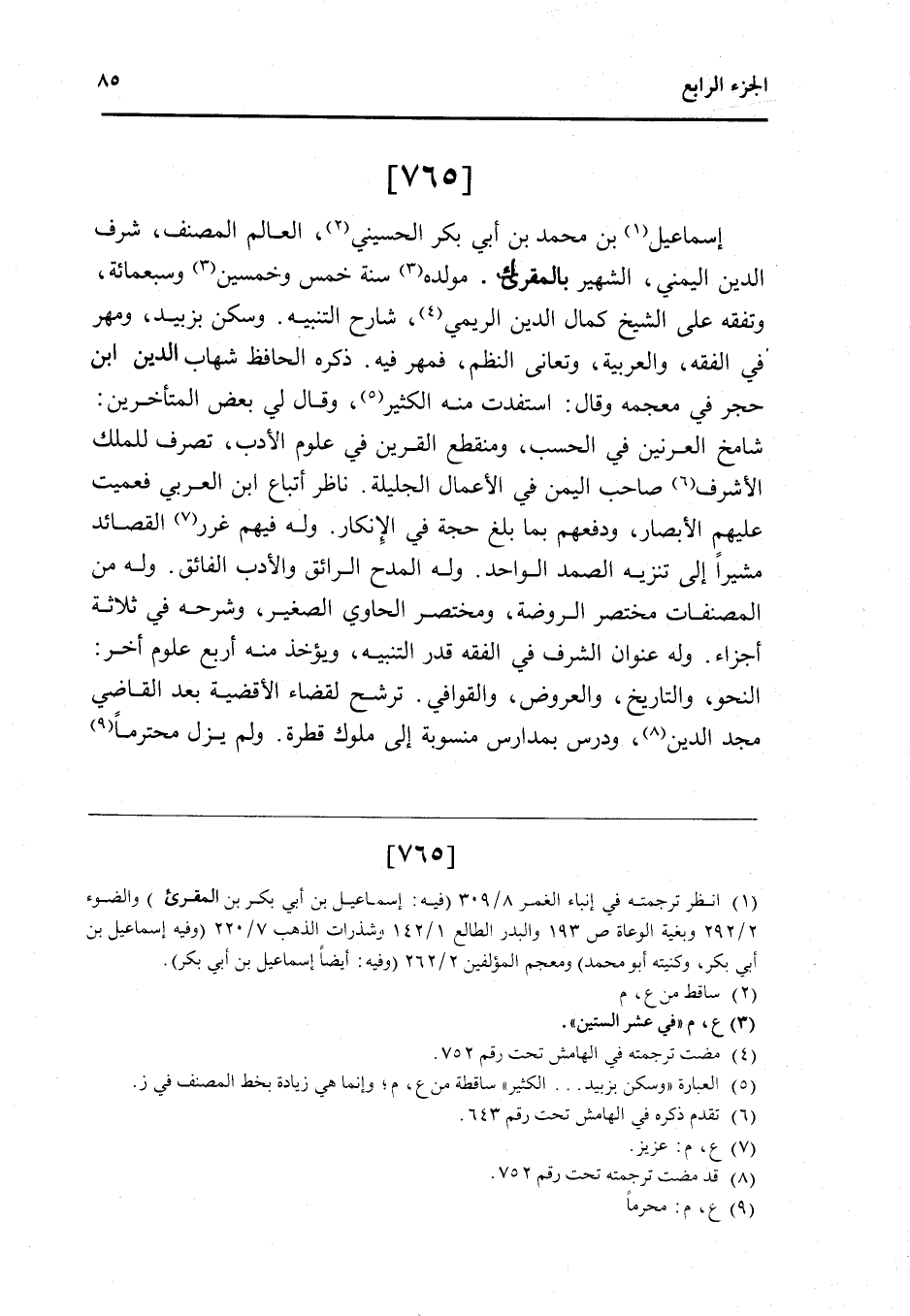 - إِسْمَاعِيل بن مُحَمَّد بن أبي بكر الْحُسَيْنِي الْعَالم المُصَنّف شرف الدَّين اليمني الشهير بالمقرىء مولده سنة خمس وَخمسين وَسَبْعمائة وتفقه على الشَّيْخ كَمَال الدَّين الريمي شَارِح التَّنْبِيه وَسكن بزبيد وَمهر فِي الْفِقْه والعربية وتعانى النّظم فمهر فِيهِ ذكره الْحَافِظ شهَاب الدَّين ابْن حجر فِي مُعْجَمه وَقَالَ اسْتَفَدْت مِنْهُ الْكثير وَقَالَ لي بعض الْمُتَأَخِّرين شامخ الْعرنِين فِي الْحسب ومنقطع القرين فِي عُلُوم الْأَدَب تصرف للْملك الْأَشْرَف صَاحب الْيمن فِي الْأَعْمَال الجليلة نَاظر أَتبَاع ابْن الْعَرَبِيّ فعميت عَلَيْهِم الْأَبْصَار ودفعهم بِمَا بلغ حجَّة فِي الْإِنْكَار وَله فيهم غرر القصائد مُشِيرا إِلَى تَنْزِيه الصَّمد الْوَاحِد وَله الْمَدْح الرَّائِق وَالْأَدب الْفَائِق وَله من المصنفات مُخْتَصر الرَّوْضَة ومختصر الْحَاوِي الصَّغِير وَشَرحه فِي ثَلَاثَة أَجزَاء وَله عنوان الشّرف فِي الْفِقْه قدر التَّنْبِيه وَيُؤْخَذ مِنْهُ أَربع عُلُوم أخر النَّحْو والتاريخ وَالْعرُوض والقوافي ترشح لقَضَاء الْأَقْضِيَة بعد القَاضِي مجد الدَّين ودرس بمدارس منسوبة إِلَى مُلُوك قَطْرَة وَلم يزل مُحْتَرما