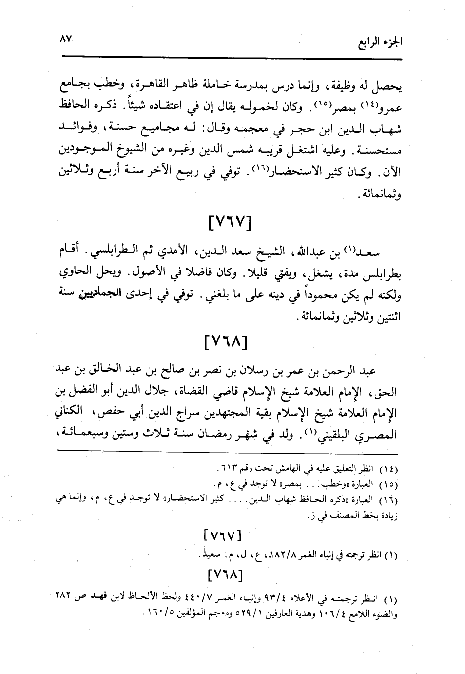 767 - سعد بن عبد الله الشَّيْخ سعد الدَّين الأمدي ثمَّ الطرابلسي أَقَامَ بطرابلس مُدَّة يشغل ويفتي قَلِيلا وَكَانَ فَاضلا فِي الْأُصُول وَيحل الْحَاوِي وَلكنه لم يكن مَحْمُودًا فِي دينه على مَا بَلغنِي توفّي فِي إِحْدَى الجماديين سنة اثْنَتَيْنِ وَثَلَاثِينَ وَثَمَانمِائَة